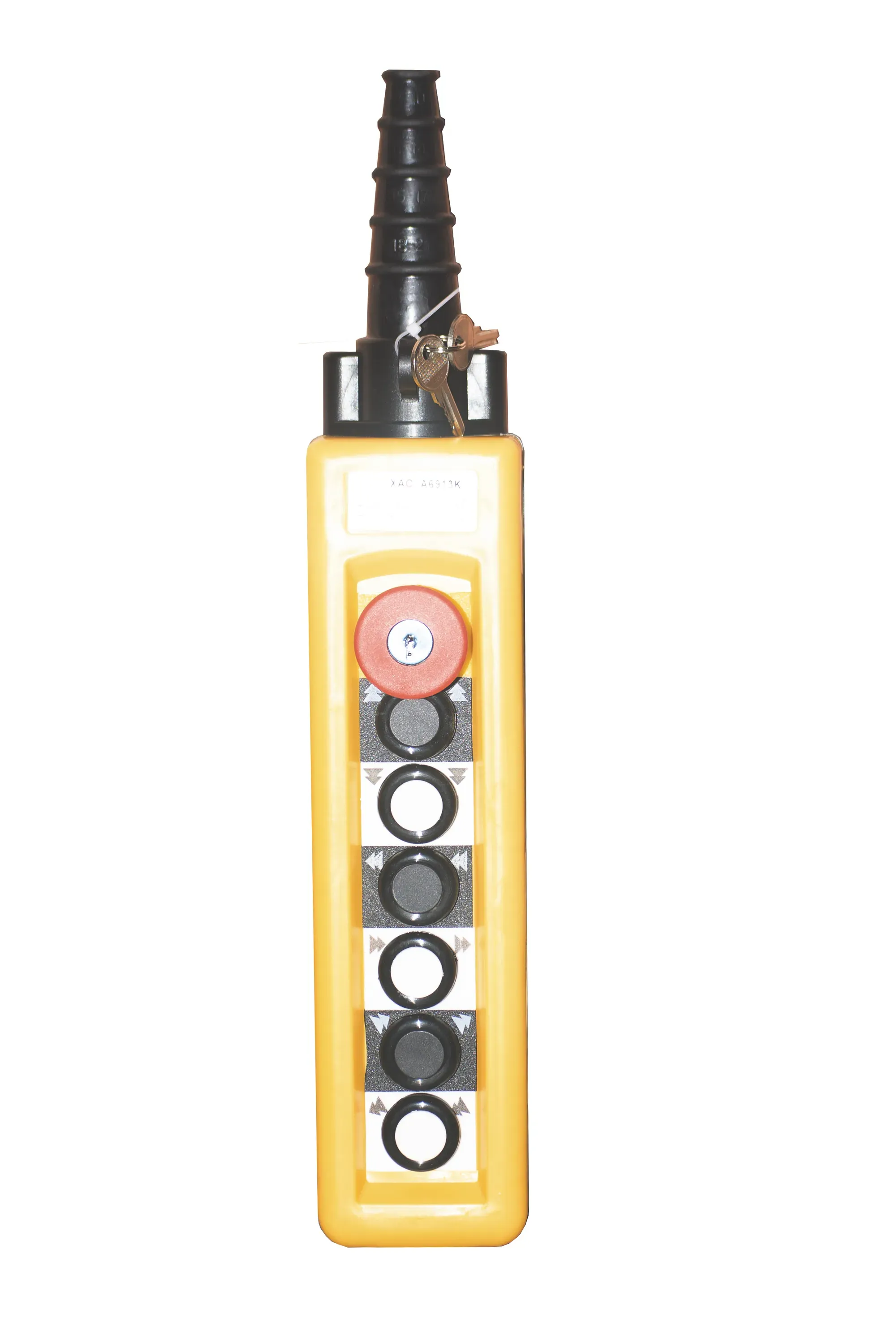 Пульт управления краном XAC-А6913К, 6 кнопок, 2 скор., авар. стоп, ключ (пост управления кнопочный для тельфера) – является управляющим устройством для грузоподъёмного оборудования, который передаёт электрический сигнал по кабелю, на катушку магнитного пускателя, тем самым коммутирует контакты пускателя, для передачи фазы на двигатель перемещения, либо подъема тельфера.