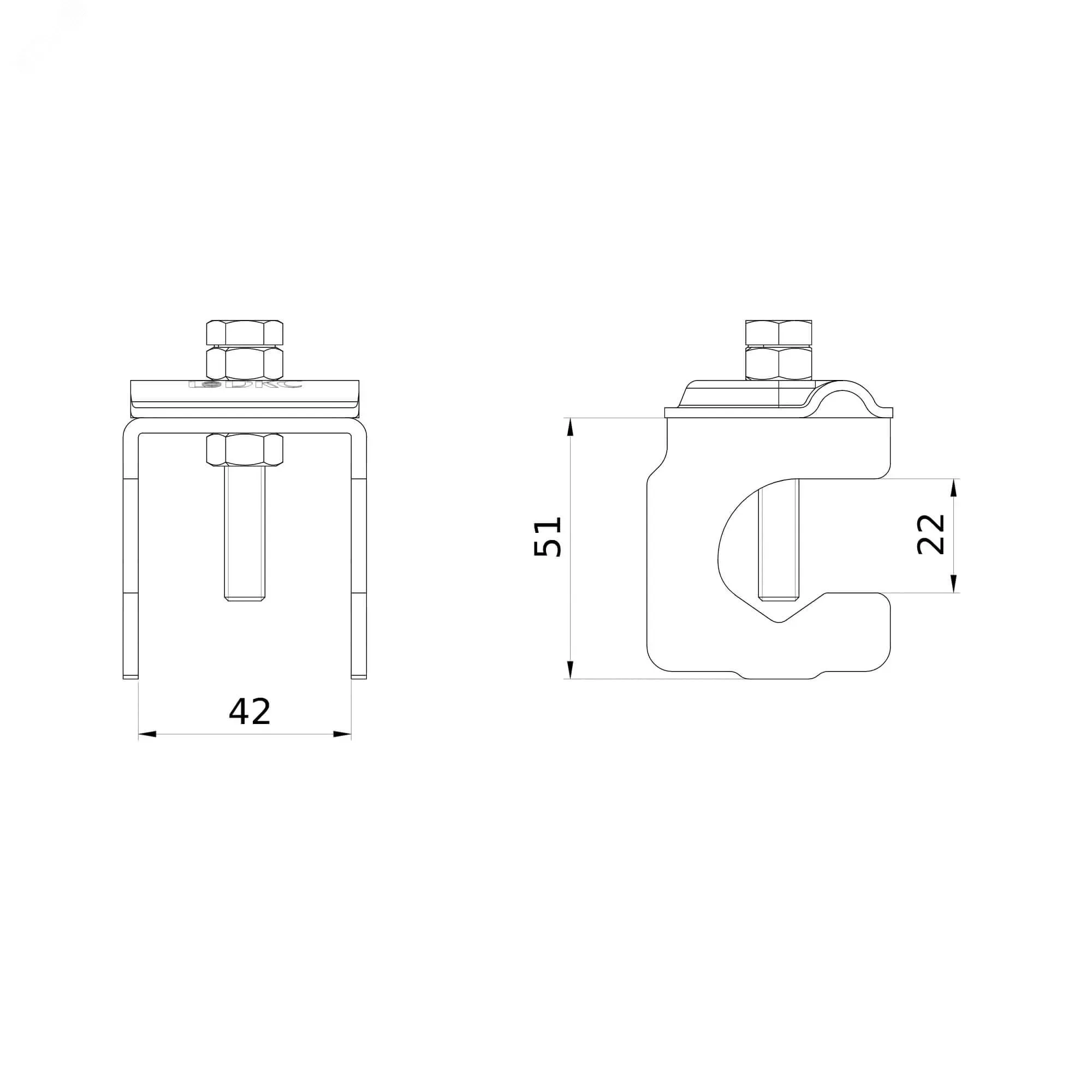 Арматурный зажим с наконечником используется для подключения плоского (25-40 мм) либо круглого (8-10 мм) проводника к стальной арматуре. Максимальная толщина полосы - 5 мм. Материал - оцинкованная сталь.