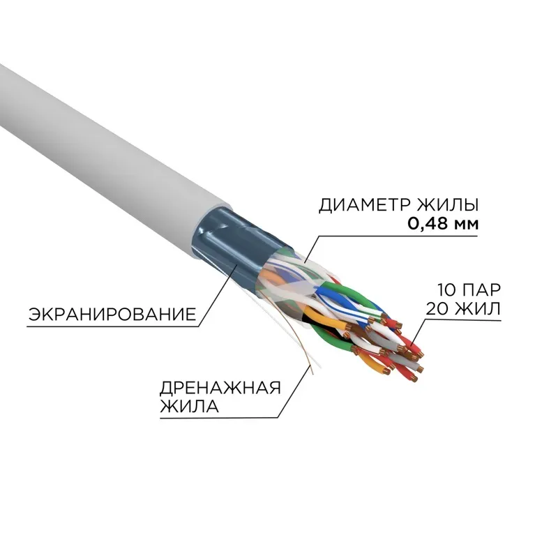 многопарный кабель - неэкранированный U/UTP - категория 5 - 10 пар - калибр 24 AWG - одножильный (solid) - оболочка LSZH нг(А) - HF - температура –20°C – +60°C - цвет серый