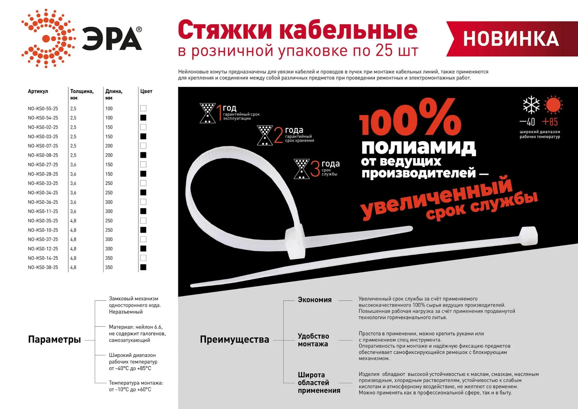 Нейлоновой хомут предназначен для увязки кабелей и проводов в пучок при монтаже кабельных линий, также применяется для крепления и соединения между собой различных предметов при ремонтных и электромонтажных работах. Изготовлен хомут из нейлона 6.6, который обладает высокой устойчивостью к маслам, смазкам, масляным производным, хлоридным растворителям, устойчивостью к слабым кислотам. При производстве хомутов черного цвета добавляется угольный порошок, он улучшает физические свойства стяжке в стойкости к УФ-излучению (прямые солнечные лучи). Нейлоновый хомут прост в применении его можно крепить руками или с применением спец инструмента. Обеспечивает оперативность при монтаже и гарантирует надёжную фиксацию предметов.
