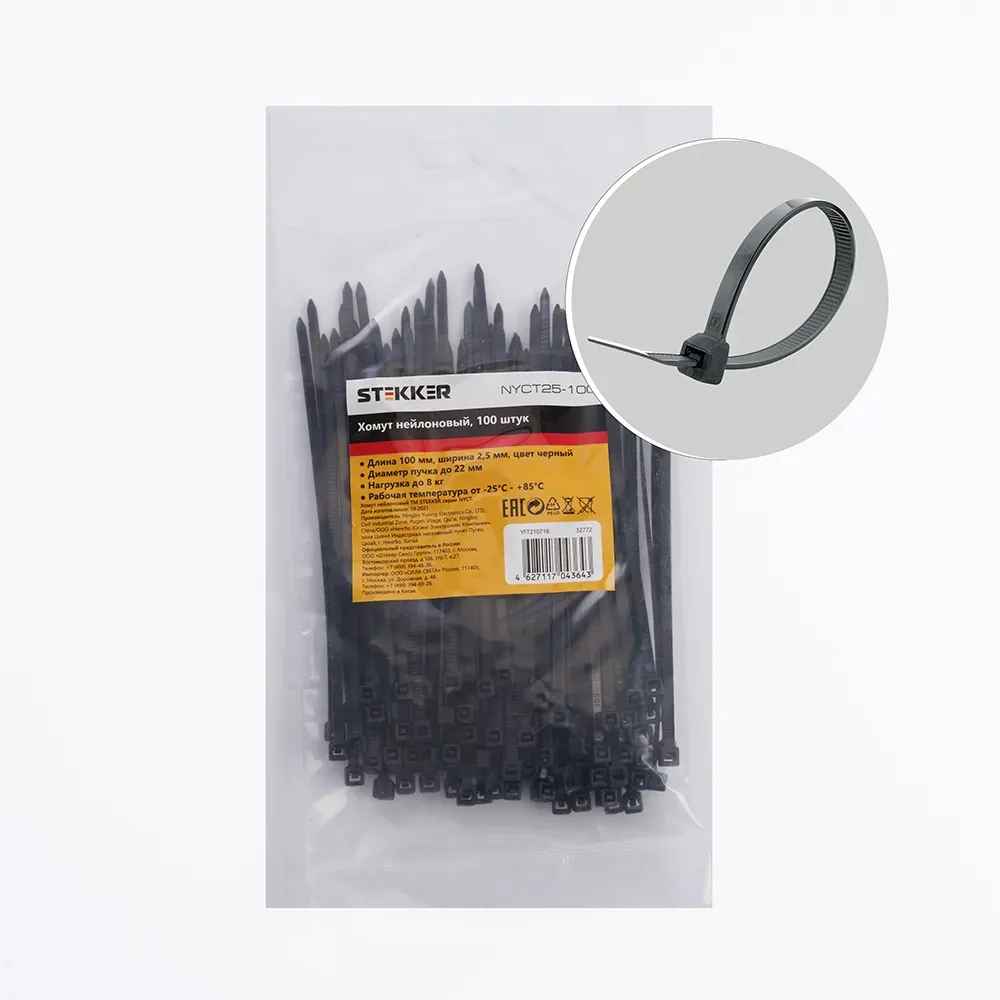 Хомут нейлоновый 2,5x100 мм, d пучка max 22 мм, нагрузка 8 кг, черный, (100шт в упак), STEKKER 32772