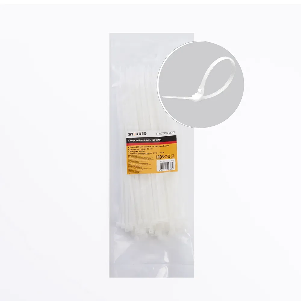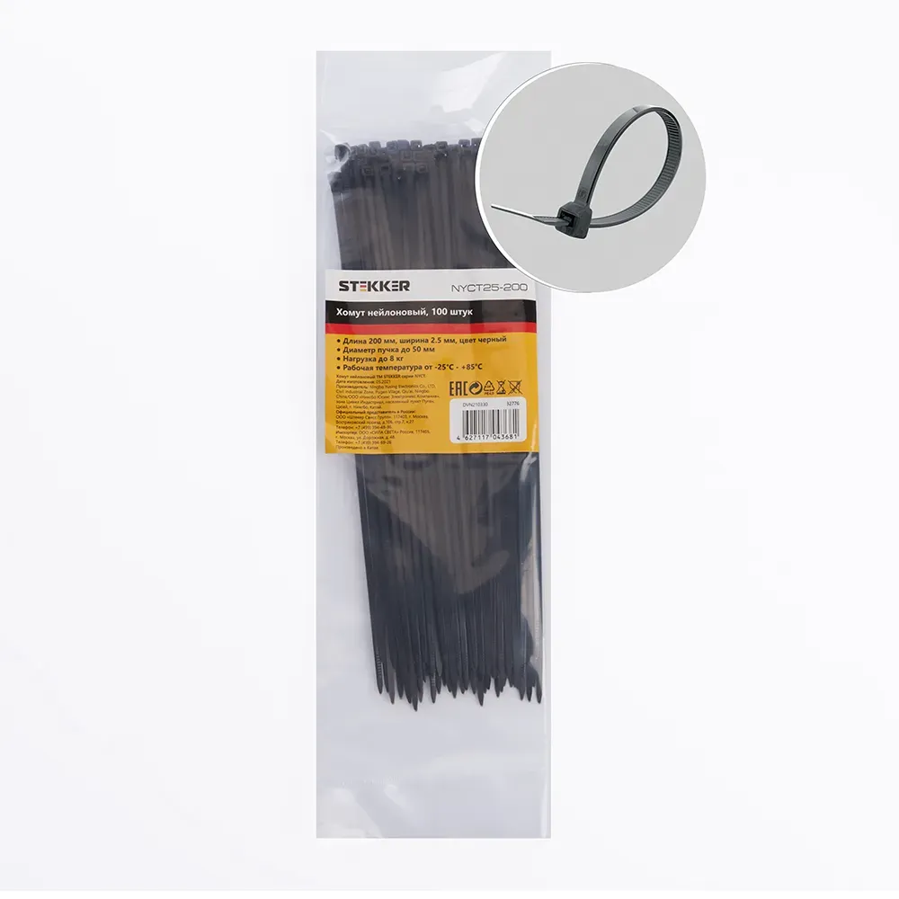 Хомут нейлоновый 2,5x200 мм, d пучка max 50 мм, нагрузка 8 кг, черный, (100шт в упак), STEKKER 32776