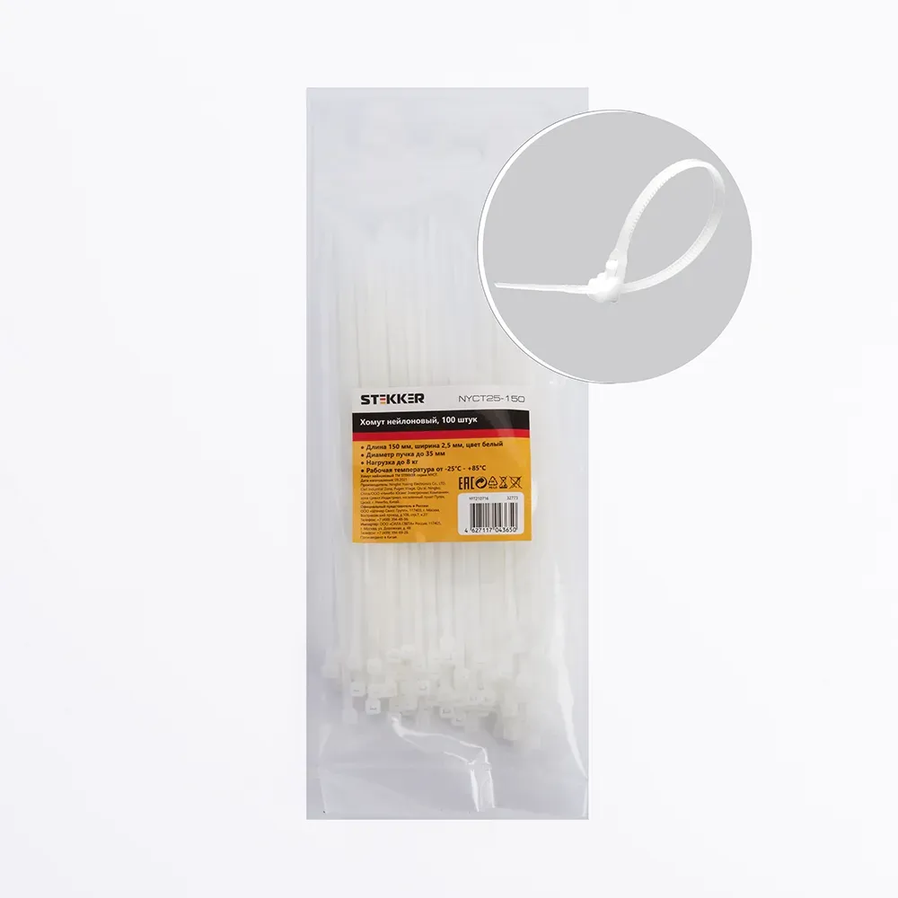 Хомут нейлоновый 2,5x150 мм, d пучка max 35 мм, нагрузка 8 кг, черный, (100шт в упак), STEKKER 32774