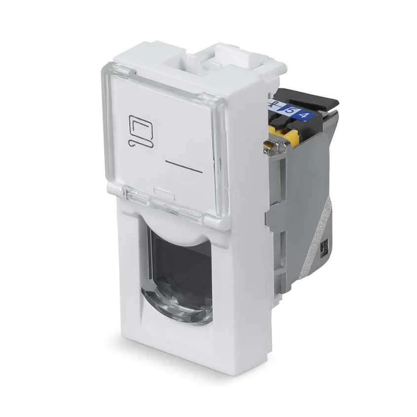 Компьютерная розетка 1-местная Legrand Mosaic New RJ45 076551 одномодульная 5E UTP белая идеально подходит для любых типов слаботочных кабелей. Монтаж розетки осуществляется быстро и легко без использования специальных инструментов благодаря специальному коннектору. Может использоваться как с одножильными, так и с многожильными проводниками 26-22 AWG. Имеет цветовую кодировку 568 A/B и цифровую маркировку контактов. Конструкция с предусмотренным боковым вводом кабеля обеспечивает максимально удобную установку на любые монтажные посты. Розетка Legrand Mosaic New RJ45 076551 относится к категории 5e и полностью соответствует стандартам ISO/IEC изд. 2.0, EN 50173-1 и EIA/TIA 568.