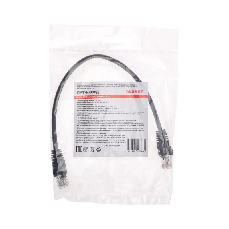 | Патч-корд U/UTP, CAT 5e, RJ45-RJ45, 26AWG, LSZH, чёрный, 0,3 м REXANT, 02-0102-03. | |