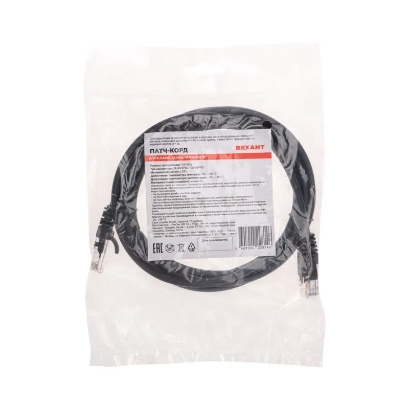 | Патч-корд U/UTP, CAT 5e, RJ45-RJ45, 26AWG, LSZH, чёрный, 2 м REXANT, 02-0102-2. | |