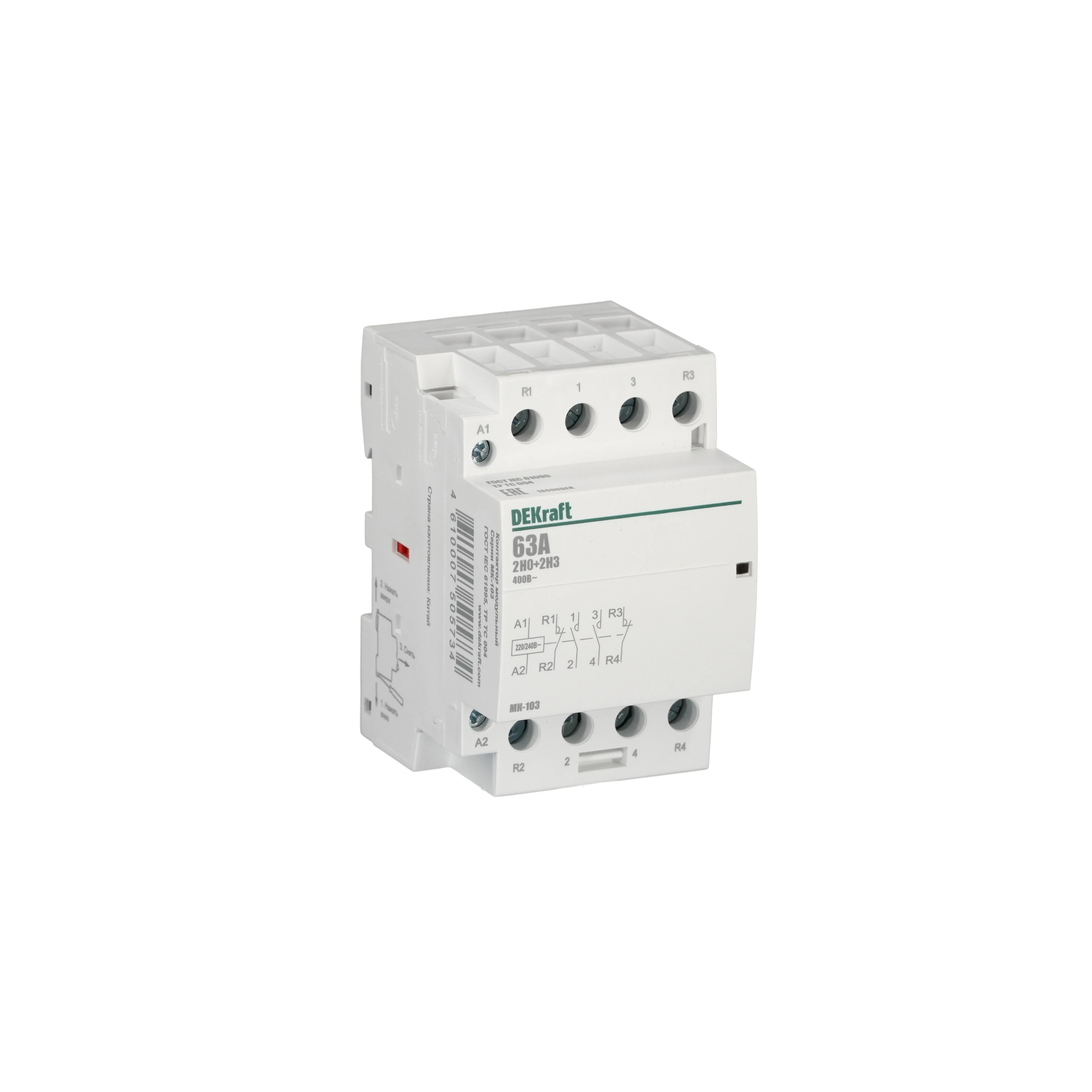 Модульный контактор серии МК-103 DEKraft; ном.ток 63 А (АС-7а); кол-во и исполнение контактов - 2НО+2НЗ; напряжение управления 220 В пер.тока; ширина - 3 мод. х 18 мм; установка - на DIN-рейку. Контакторы МК-103 применяются в сетях напряжением до 400 В пер.тока для дистанционного управления небольшими нагрузками, требующими большого количества включений / отключений, например, насосы, системы вентиляции и т.п. Модульные контакторы не требуют дополнительных настроек и специального обслуживания.