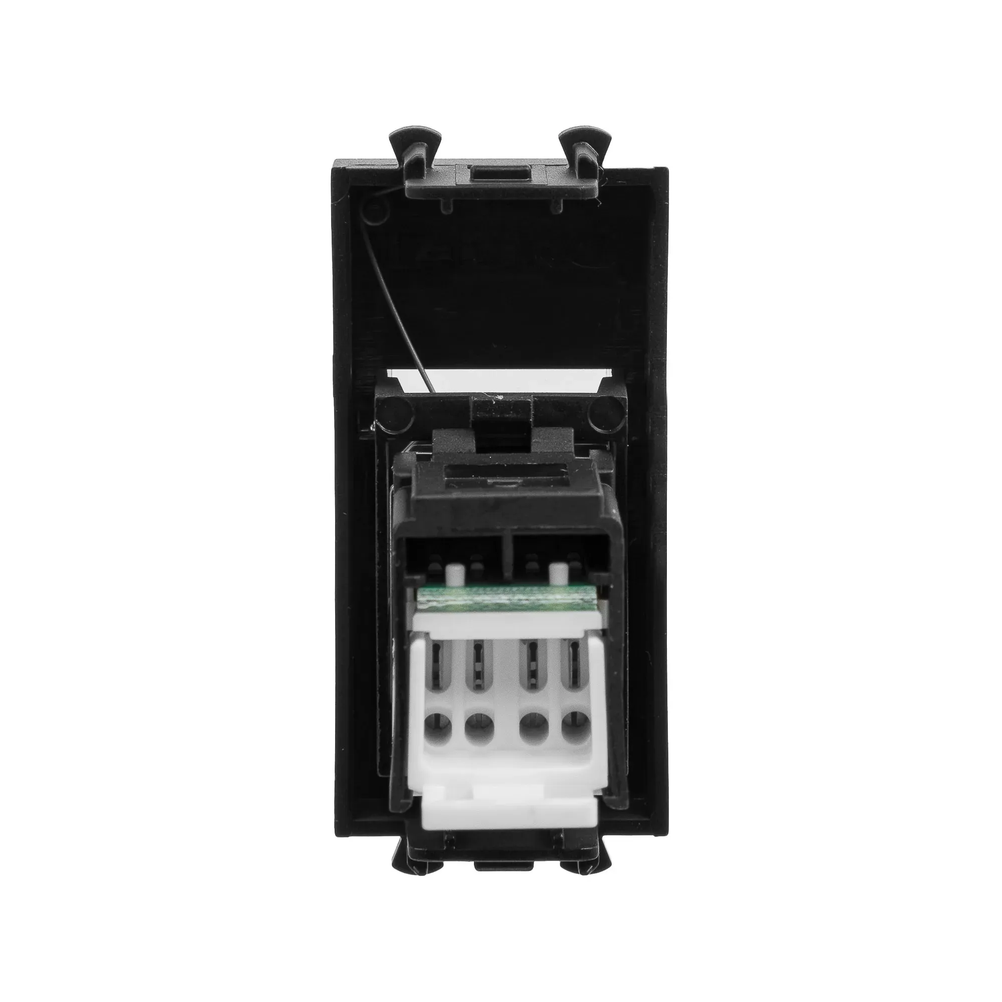 Компьютерная розетка RJ-45 модульная. Категория: 6. Предназначена для монтажа в систему пластиковых кабельных коробов ''In-liner Front'' и систему алюминиевых кабельных коробов и колонн ''Aero'' при помощи рамок-суппортов и каркасов ''Avanti'' (код 4400912 и т.д.). Используется для подключения сетевого кабеля к рабочему месту. Характеристики: 8P8C, с пылезащитной шторкой, с маркировочной табличкой, в комплекте разъем Keystone. Заделка не требует инструмента. Фиксация производится в подрозеточные коробки глубиной не менее 45 мм при помощи каркаса с лапками (код 4400802) и саморезов. 1 модуль. Цвет: ''Черный матовый''