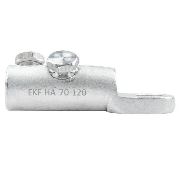 Болтовой наконечник типа НА предназначен для оконцевания предварительно зачищенных от изоляции жил проводов и кабелей, и подключения к клеммам электрооборудования. Подходит для подключения медных и алюминиевых проводов. Эксцентриковое отверстие цилиндрической части, на внутренней поверхности нанесена рифленая накатка и добавлена контактная смазка. Болты со срывной головкой, расположенные под углом друг к другу. При достижении момента, необходимого для создания надежного электрического контакта, происходит срыв головки болта ниже уровня плоскости поверхности наконечника. Наконечник устойчив к ультрафиолетовому и солнечному излучению, высоким и низким температурам, коррозии и агрессивным атмосферным воздействиям.