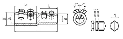 Предназначены для соединения любого типа кабельных жил - алюминиевых и медных, круглых и секторных, моножильных и многопроволочных при переходе на меньший диапазон сечения. Каждый болтовой соединитель является мультиразмерным. Х-образное угловое расположение болтов соответствует европейским стандартам и гарантирует механическую прочность соединения. Центрально-симмтричные отверстия под кабельную жилу в корпусе соединителя. Материал корпуса и болтов - специальный алюминиевый сплав. Покрытие - без покрытия. Крепление на жиле осуществляется методом завинчивания болтов со срывной головкой. Болтовые головки срываются при достижении установленного момента, обеспечивающего оптимальные механические и электрические свойства контактного соединения. Конструкция болтов имеет несколько проточек — срывных 'шеек', благодаря чему срыв головки происходит вровень или ниже поверхности соединителя. Соединители имеют внутреннюю конструктивную перегородку, определяющую глубину захода кабельной жилы