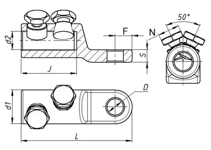 Наконечник болтовой кабельный 2НБВ-1-005 с V-образным расположением болтов предназначены для оконцевания алюминиевых и медных жил кабеля пластиковой изоляцией до 10 кВ. Закрепление наконечника на жиле кабеля осуществляется болтами со срывной головкой, которая скручивается при достижении определенного усилия, обеспечивая надежное соединение. Диаметр отверстия лопатки 2НБВ-1-005 - 10.5 мм под болт.
