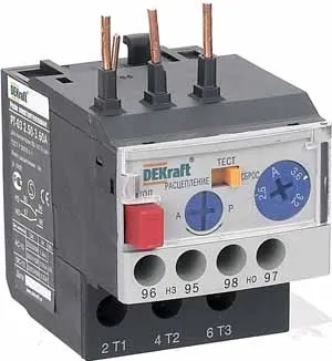 Тепловое реле перегрузки серии РТ-03 DEKraft; предназначено для применения с контакторами КМ-103 на ток 9-18 А; трехполюсное; диапазон уставок реле 1,80-2,50 А; класс расцепления - 10А; два режима повторного включения - ручной и автоматический. Тепловые реле РТ-03 применяются для защиты цепей переменного тока и электродвигателей от перегрузки, асимметрии фаз, затянутого пуска и заклинивания ротора. Реле подходит к соответствующим контакторам других производителей.