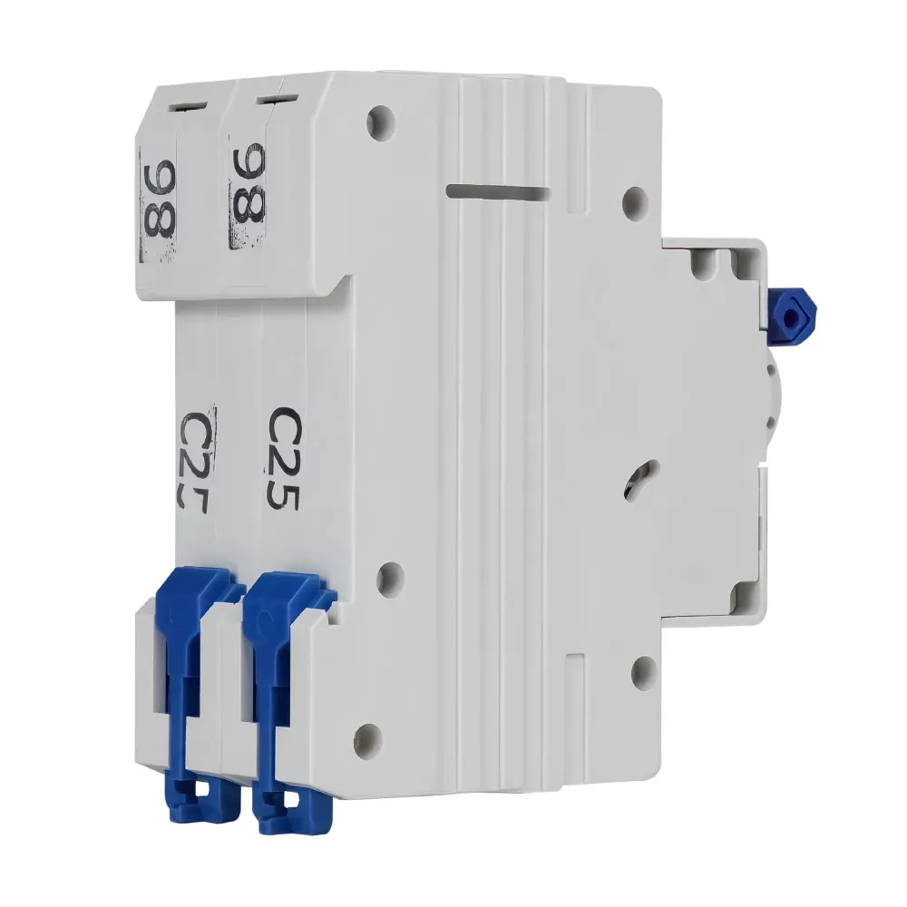 Модульный автоматический 2 полюсный выключатель переменного тока с предельной коммутационной способностью при переменном токе 6 кА на номинальный ток 25 А.