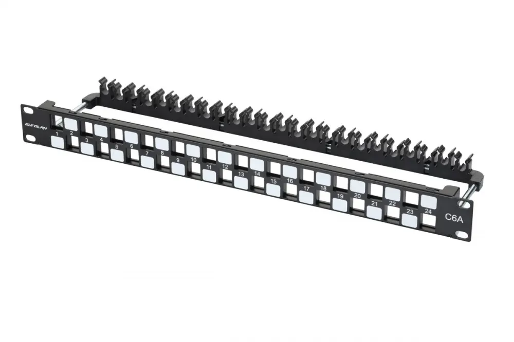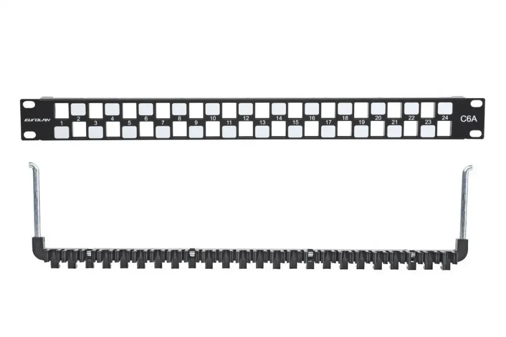 Отзывы о Коммутационная патч-панель наборная Eurolan, 19", 1HU, портов: 24 х keystone, кат. 6A, неэкр., с задним кабельным организатором (без модулей), цвет: чёрный, (27B-00-24BL-UA) )