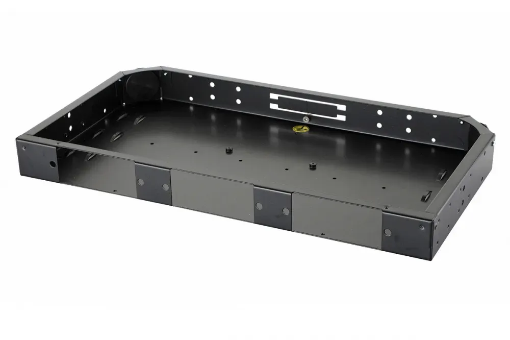 Особенность конструкции: отверстие для установки MTP-адаптера в боковой стенке; фиксаторы внешней оболочки кабеля - скобы под стяжки.