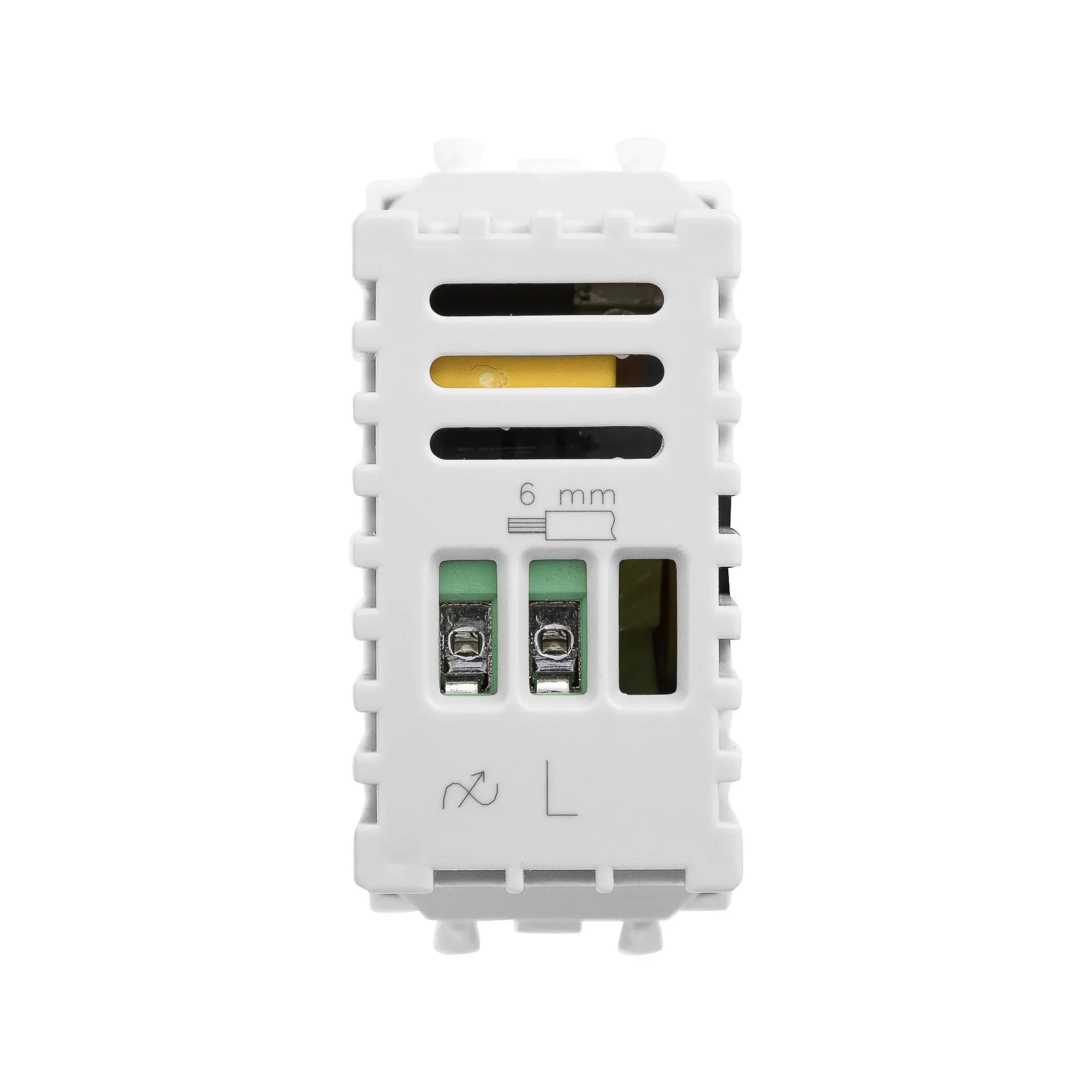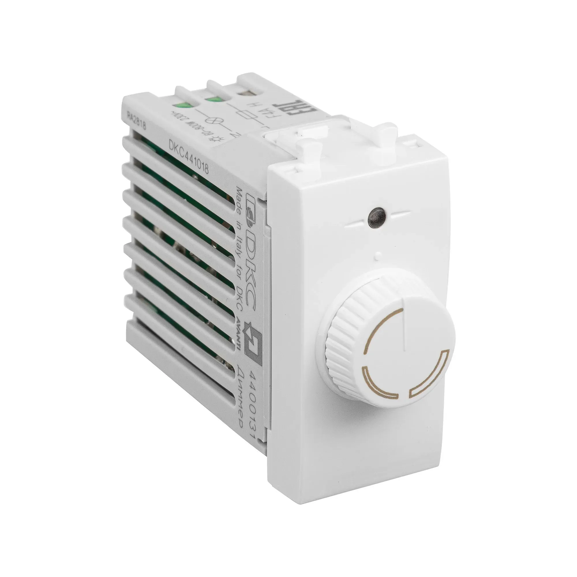 Диммер поворотный модульный. Предназначен для монтажа в системы \'In-liner Front\' и \'In-liner Aero\' при помощи рамок-суппортов и каркасов \'Avanti\' (код 4400912 и т.д.). Используется для управления уровнем освещения помещения, доступно регулирование 60–800 Вт для ламп накаливания и галогенных ламп. Диаметр отверстий для ввода кабелей – 3 мм, винтовые зажимы, шаблон для зачистки кабеля – 11 мм, встроенная подсветка. Фиксация в подрозеточные коробки глубиной не менее 45 мм при помощи каркаса с лапками (код 4400802) и саморезов. 1 модуль. Цвет- \'Белое облако\'.