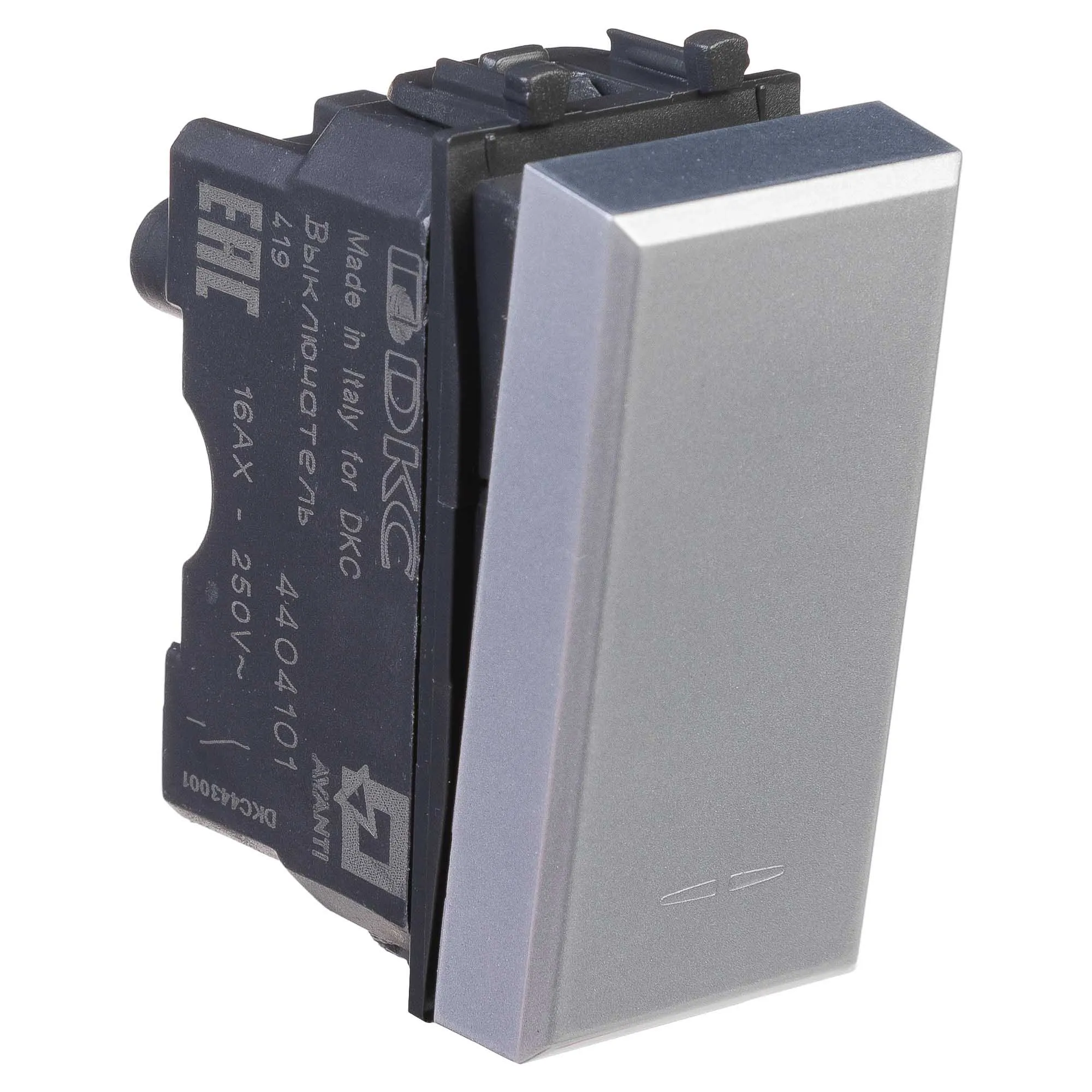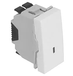 Выключатель с подсветкой. Назначение- включение/выключение освещения. Характеристики- номинальный ток ? 16 А, номинальное напряжение ? 250 B. Кол-во модулей- 2. Цвет- черный