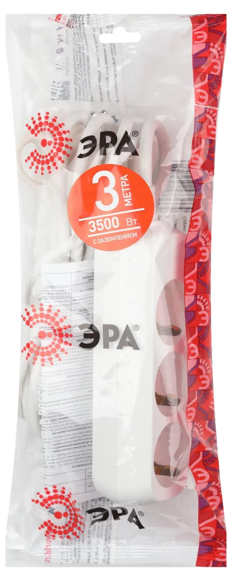 Удлинитель электрический Эра U-3e-3m с заземлением, ПВС, 3x1мм2, 3 розетки, 3м. Рассчитан на максимальную мощность 16А/3500 Вт. Удлинитель Эра станет Вашим надежным помощником, если Ваши любимые электроприборы находятся далеко от розеток. Провод в удлинителях Эра сделан из 100% меди, что делает его абсолютно пожаробезопасным. Корпус выполнен из ударопрочного и негорючего пластика (полипропилен). В моделях с заземлением у вилки есть кольцо для удобного извлечения из розетки. Модель удлинителя на 16А позволяет подключить мощные бытовые приборы общей нагрузкой до 3500Вт. Не бойтесь включить чайник, обогреватель, микроволновку или другие электроприборы. Толстый провод удлинителя Эра гарантирует полную безопасность. Дизайн удлинителя разработан в России командой Эра Style.