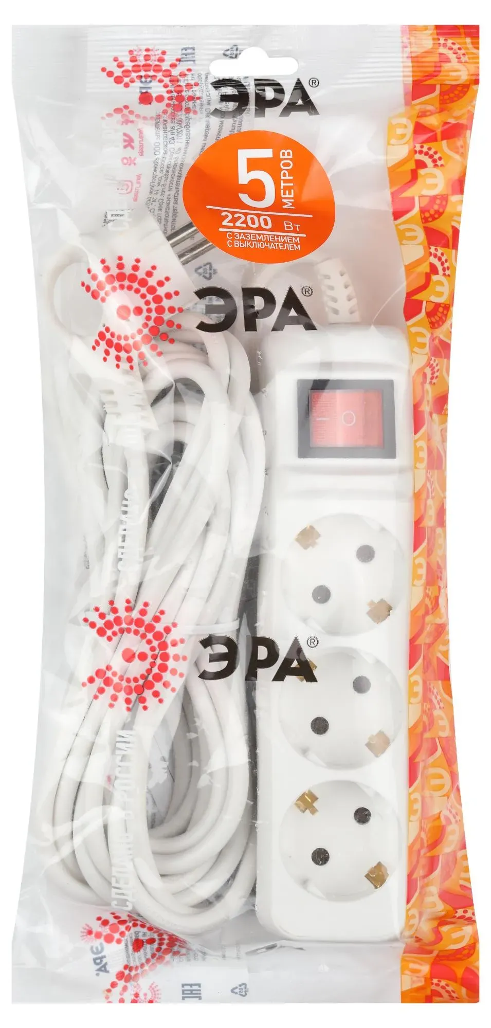 Удлинитель электрический Эра UX-3es-5m с заземлением, с выключателем, ПВС, 3x0,75мм2, 3 розетки, 5 м. Рассчитан на максимальную мощность 10А/2200 Вт. Удлинитель Эра станет Вашим надежным помощником, если Ваши любимые электроприборы находятся далеко от розеток. Провод в удлинителях Эра сделан из 100% меди, что делает его абсолютно пожаробезопасным. Корпус выполнен из ударопрочного и негорючего пластика (полипропилен). Вилка обеспечена кольцом для удобного извлечения ее из розетки. Модель удлинителя на 10А позволяет подключить бытовые приборы общей нагрузкой до 2200Вт. Дизайн удлинителя разработан в России командой Эра Style.