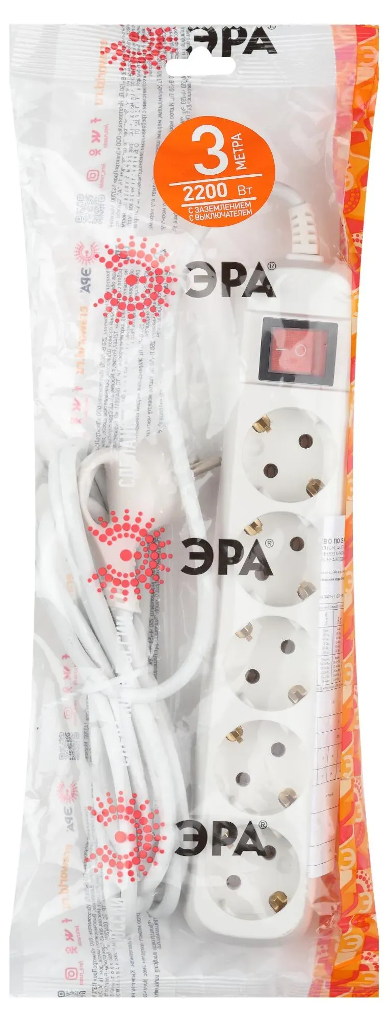 Отзывы о Удлинитель электрический с заземлением с выключателем 5 розеток 3 м ПВС 3x0,75мм2 10А UX-5es-3m ЭРА ЭРА Б0035757 )