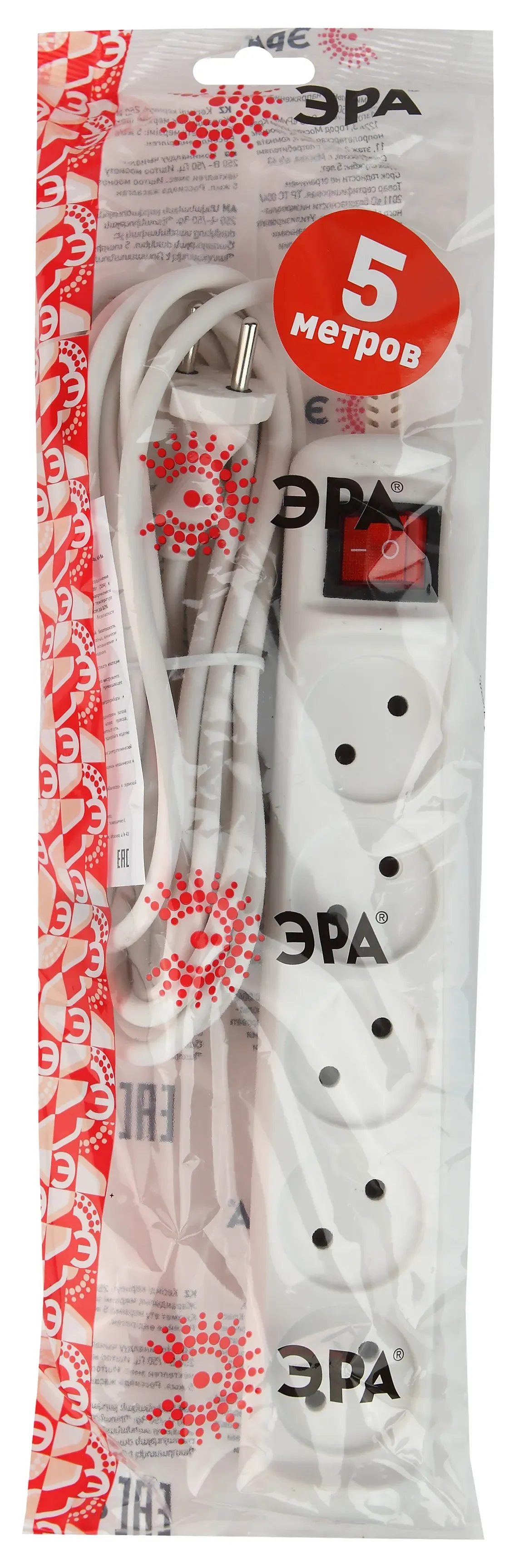 Удлинитель электрический Эра U-5s-5m-2x1 без заземления, c выключателем, 5 розеток, 5м ПВС 2x1мм2. Рассчитан на максимальную мощность 10А/2200. Удлинитель Эра станет Вашим надежным помощником, если Ваши любимые электроприборы находятся далеко от розеток. Провод в удлинителях Эра сделан из 100% меди, что делает его абсолютно пожаробезопасным. Корпус выполнен из ударопрочного и негорючего пластика (полипропилен). Модель удлинителя на 10А позволяет подключить бытовые приборы общей нагрузкой до 2200Вт. Дизайн удлинителя разработан в России командой Эра Style.