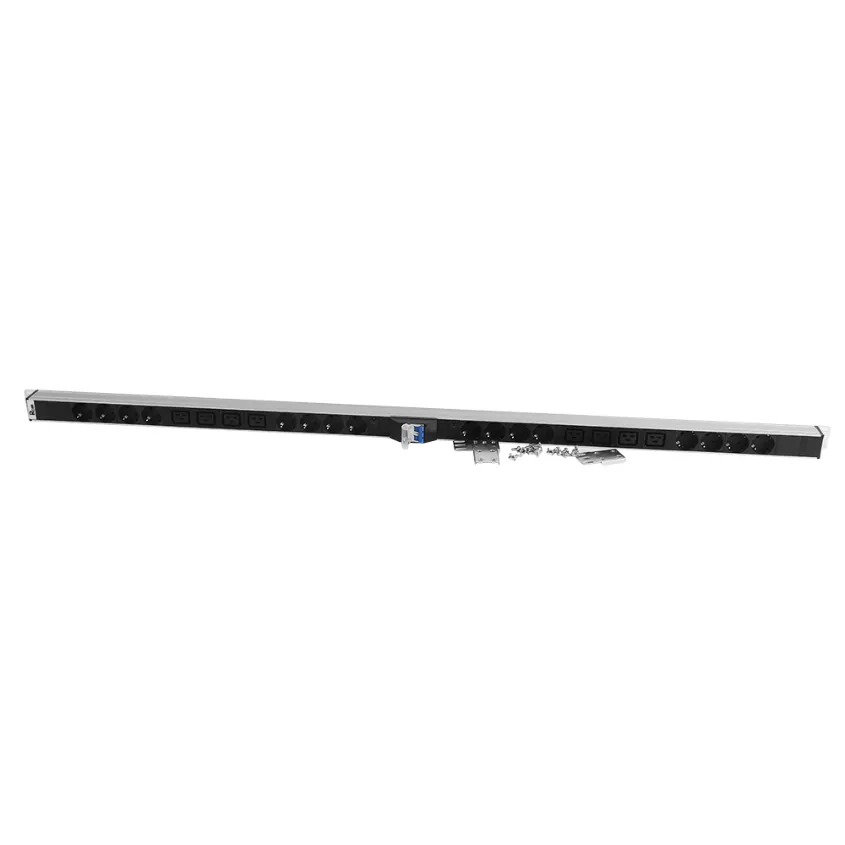 Блок силовых розеток Rem R-32-2X(8S-4C19-A-I) с автоматом защиты и разъёмами стандарта Schuko и IEC 60320 C19 на 2 контура, в анодированном алюминиевом корпусе. На лицевой части блока установлен индикатор питания. Розетки расположены под углом 45%, для удобного подсоединения коленчатых штекеров. Для подключения внешнего шнура (кабеля) предусмотрена клеммная колодка под провод номинальным сечением до 4 мм². Совместим со всеми линейками 19” монтажного оборудования. Выполнен в системе несущих конструкций 482,6 мм по ГОСТ 28601.2 (19-дюймовые конструктивы по МЭК 297).