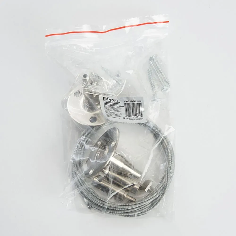 Тросы CAB1002 для подвесного крепления трековых систем и светодиодных панелей AL2115, 2116, 2117 ТМ FERON. Подвесной способ крепления светильников с помощью тросов CAB1002 незаменим помещениях с высокими или неровными потолками. Благодаря зажиму на тросе у вас есть возможность отрегулировать установку осветительного прибора на нужном вам уровне. При установке на каждый метр шинопровода необходим один комплект подвесов. Для монтажа панелей необходимо приобретать 2 комплекта.
