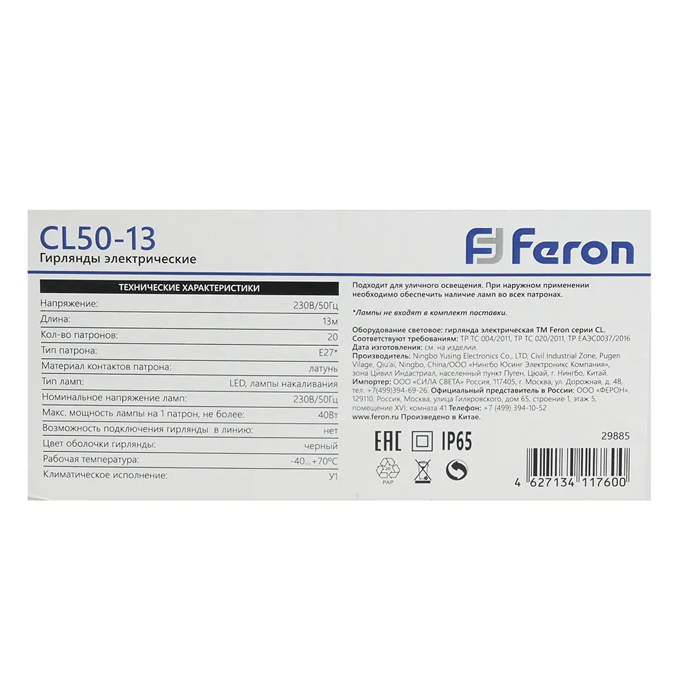 В интернет-магазине олми-коннект можно купить Гирлянда Белт-лайт 13м 20 патронов Е27 IP65 черный (комплект) FERON 29885 артикул: 29885 по цене от 2874.34 до 2980.8 рублей. Менеджеры ответят на вопросы, дадут подробную информацию по характеристикам .