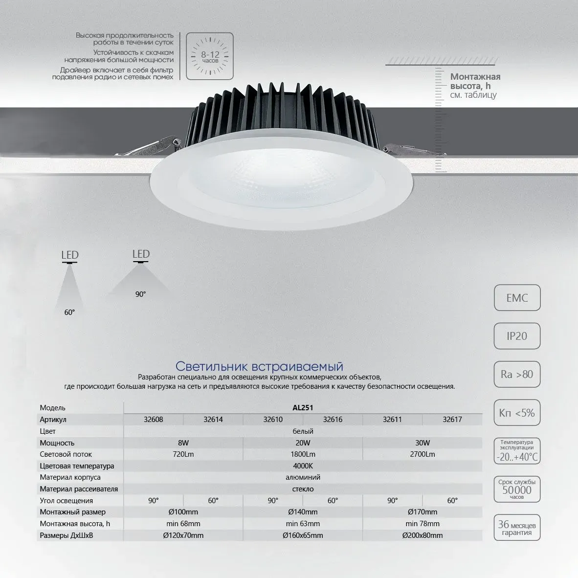 Светильник обладает прекрасной энергоэффективностью. Стильный дизайн, яркий ровный световой поток и прекрасная цветопередача являются решающими факторами в выборе этого светильника. Светильники помогут значительно сократить эксплуатационные затраты – не только за счет экономии электричества, но и за счет продолжительного срока службы без дополнительного обслуживания. Он изготавливается из высококачественных материалов, таких как светодиоды, драйверы и рассеиватели, что гарантирует их долговечность и надежность.
