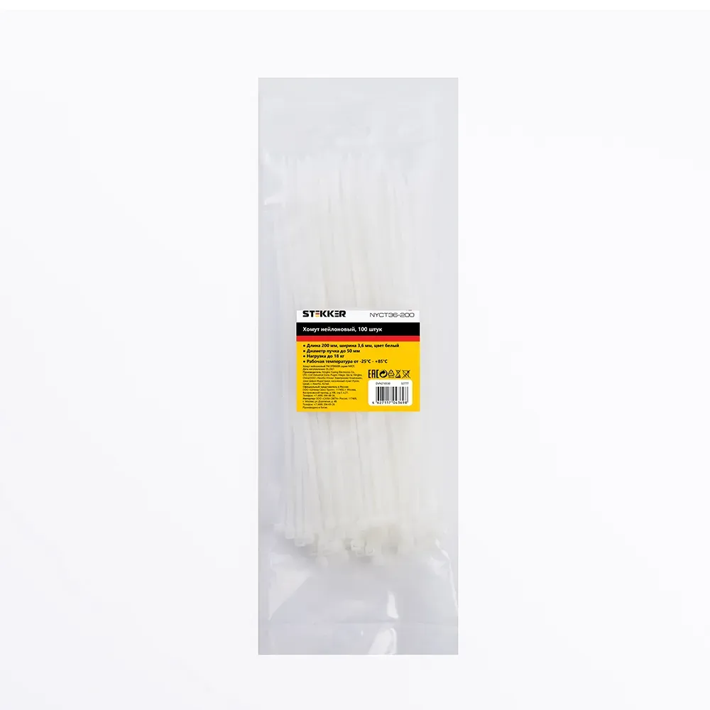 Отзывы о Хомут нейлоновый 3,6x200 мм, d пучка max 50 мм, нагрузка 18 кг, белый, (100шт в упак), STEKKER 32777 )