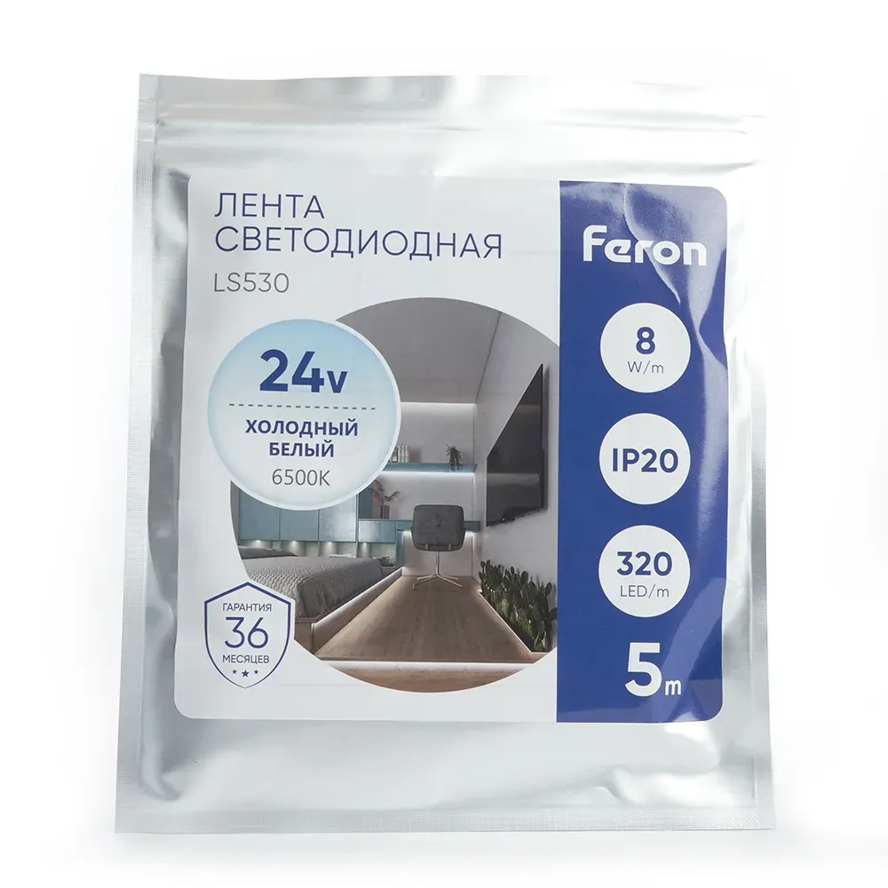 Лента оснащена 320 светодиодами типа 2110 на каждый метр, что позволяет создавать яркий и качественный свет. Одним из основных преимуществ светодиодной ленты LS530 является то, что она создает сплошной свет без выделяющихся светодиодов, что делает ее еще более эстетичной и привлекательной. Другим преимуществом является возможность использовать ленту без рассеивающих экранов. Лента имеет холодный белый свет с цветовой температурой 6500К. Она выполнена с классом защиты IP20, что обеспечивает ее безопасное использование внутри помещений. Лента обладает высоким индексом светопередачи, что позволяет передавать цвета с высокой точностью. Лента является отличным решением для декоративной подсветки интерьеров, оформления рекламы и витрин, а также подсветки полупрозрачных поверхностей. С одного конца без потери яркости можно запитать отрезок ленты длиною в 10 метров.