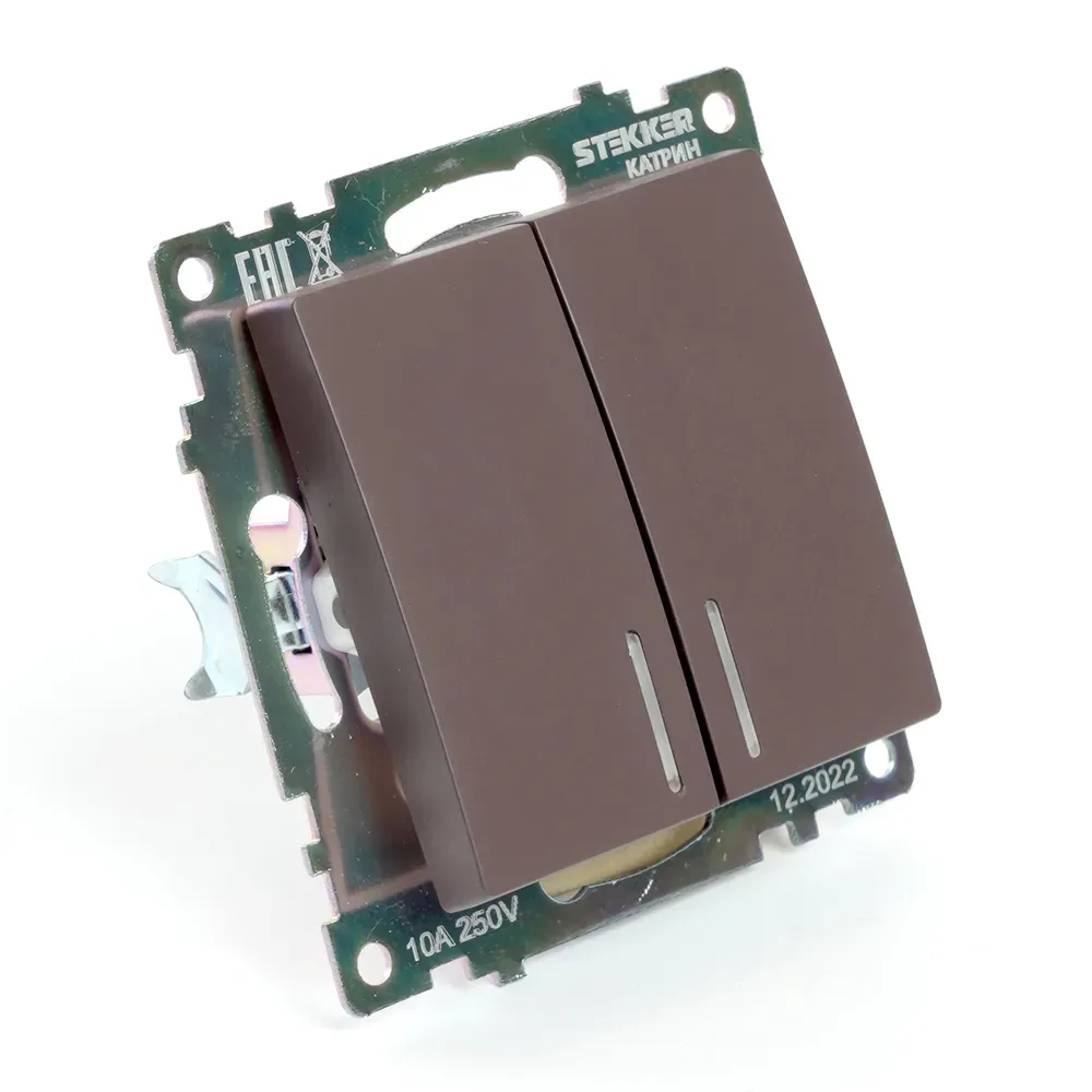 Выключатель двухклавишный c индикатором (механизм), 250В, 10А, серия Катрин, шоколад, Stekker FERON 49021
