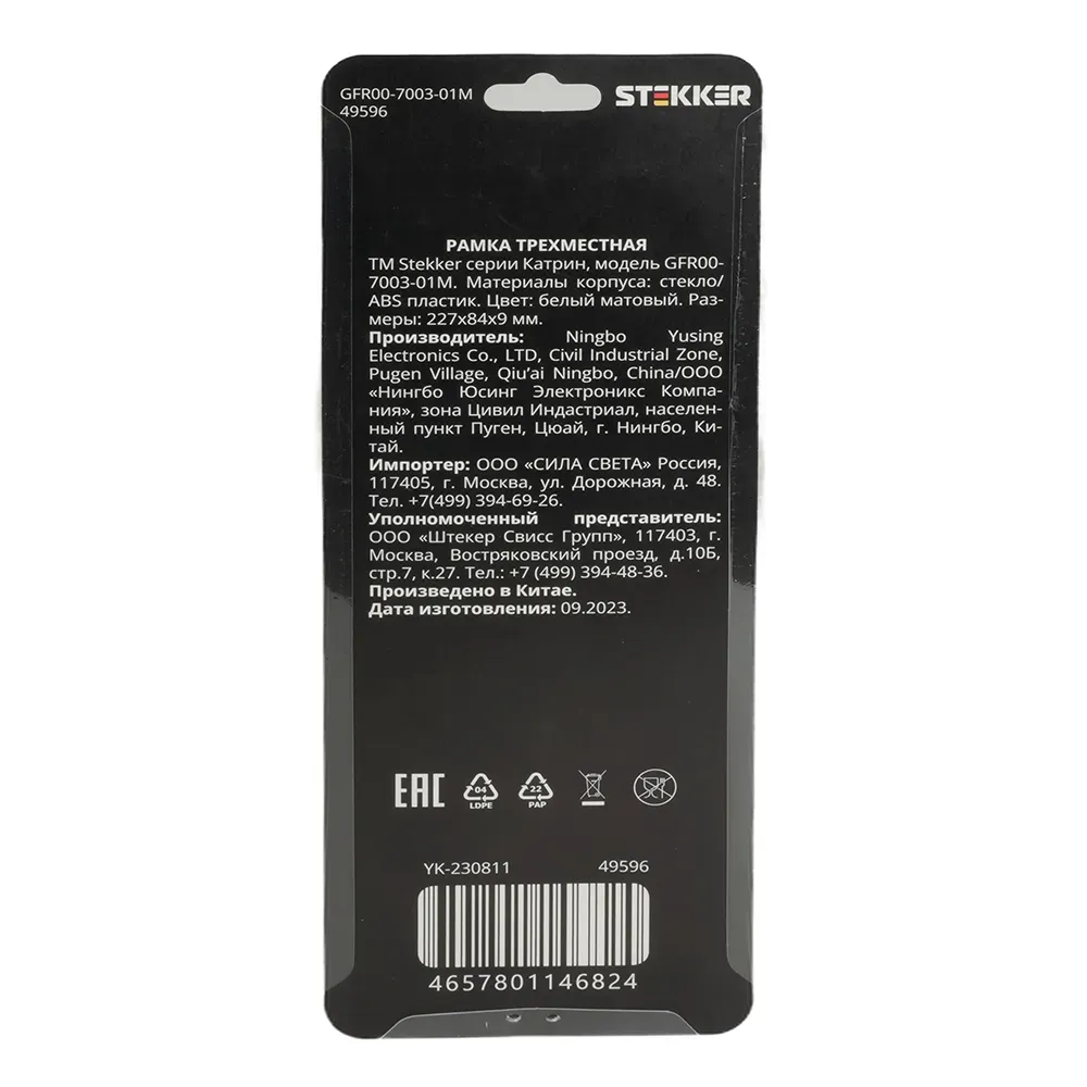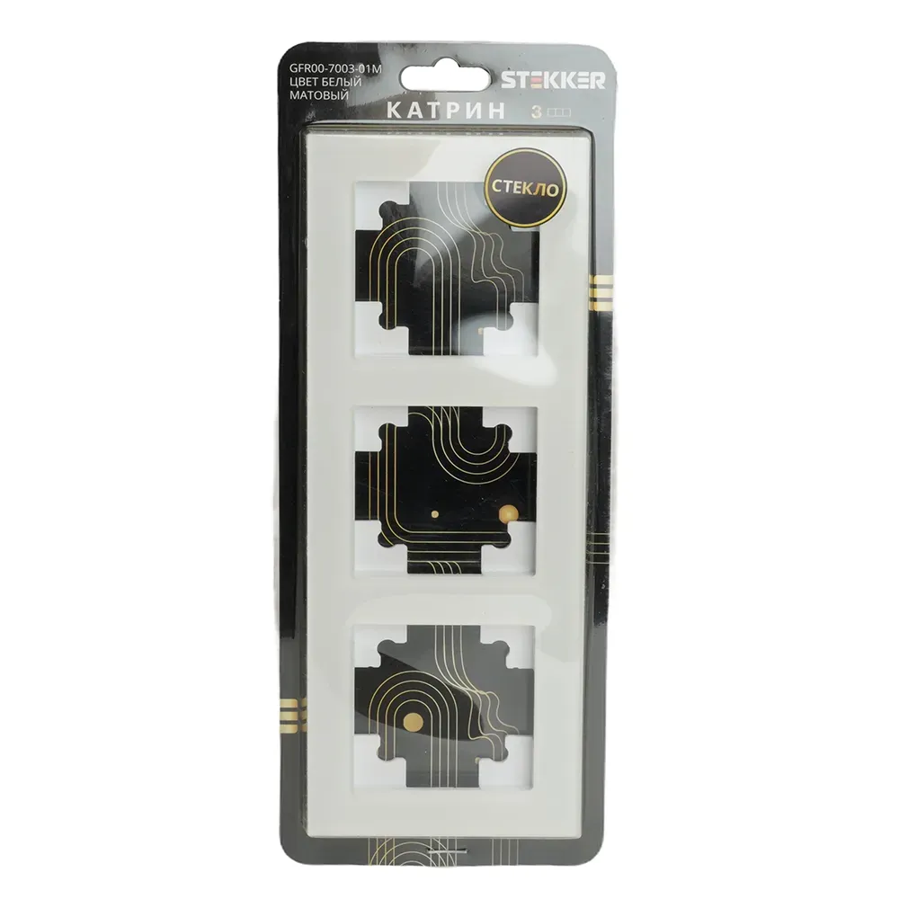 Рамка STEKKER GFR00-7003-01 на 3 поста. Материал: Стекло/ABS пластик, цвет белый, размер 227*84*9мм. Толщина стекла рамок составляет 3 мм, что придает рамке легкость и элегантность. Все пластиковые подложки выполнены в цвет стекла. Серия Катрин \'\'ТМ Stekker\'\' лаконичное и стильное решение для любого интерьера. Широкая цветовая гамма механизмов и стеклянных рамок позволяет реализовывать стильные решения и создавать уникальные акценты. Комбинации рамок и механизмов можно подобрать таким образом, чтобы создать уникальный ансамбль с освещением.