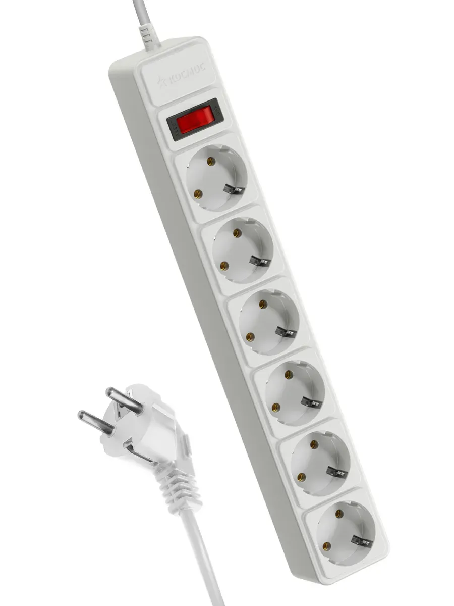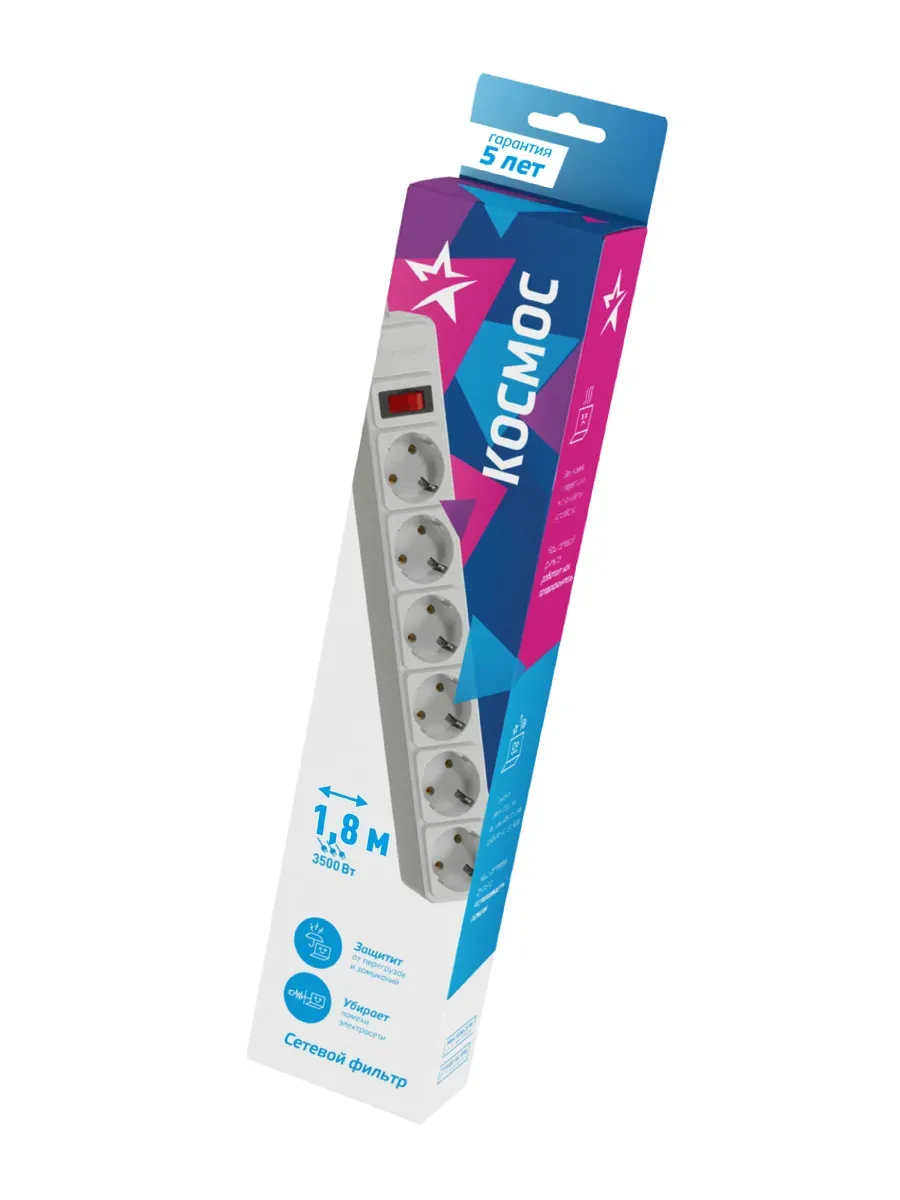Сетевой фильтр 1,8м 6 гнезд, пвс 3х1мм2, белый, сзаземлением, индикатор сети, КОСМОС КОСМОС FKsm1.8m-6g(W)16A