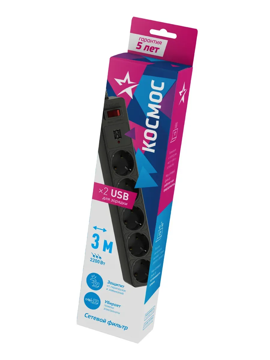 Отзывы о Сетевой фильтр 3м 5 гнезд, пвс 3х0,75мм2, черный 2 USB, КОСМОС КОСМОС FKsm3m-5g(B)USB )