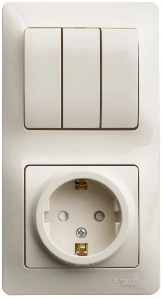 Блок комбинированный Systeme Electric (ранее Schneider Electric) серии Glossa (в сборе, цвет бежевый) предназначен для сетей до 250 В, состоит из розетки с заземлением и шторками на 16 А и 3-клавишного выключателя на 10 А. Блок удобен в применении и отлично подходит для коридора. Заземляющий контакт обеспечивает дополнительную защиту от удара электрическим током. При наличии заземления электрический потенциал уходит в землю, защищая человека. Трёхклавишный выключатель позволяет управлять тремя источниками света из одной точки. Выполнен из материала PС+ASA, стойкого к УФ-излучению и появлению царапин.