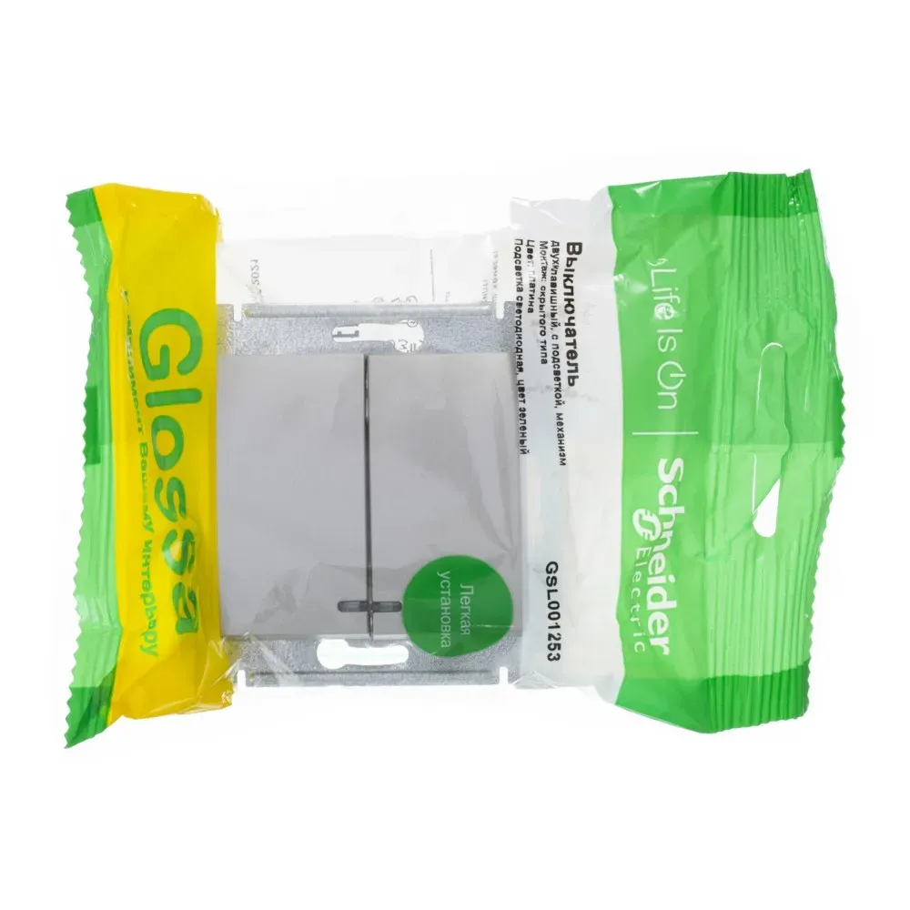 Механизм Systeme Electric (ранее Schneider Electric) серии Glossa (цвет платина) выключателя 2-клавишного c подсветкой подходит для сетей 250 В, на ток 10 А. Благодаря современной светодиодной подсветке зеленого цвета изделие легко найти в темноте. Двухклавишный выключатель позволяет управлять двумя источниками света с одной точки. Выполнен из материала PС+ASA, стойкого к УФ-излучению и появлению царапин. Эргономичные клеммы расположены в два ряда - сверху и снизу.