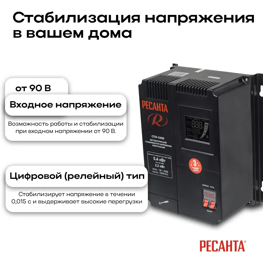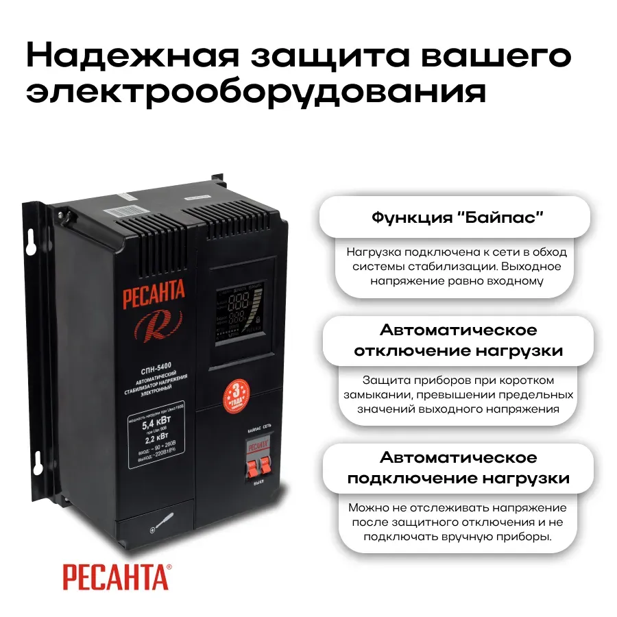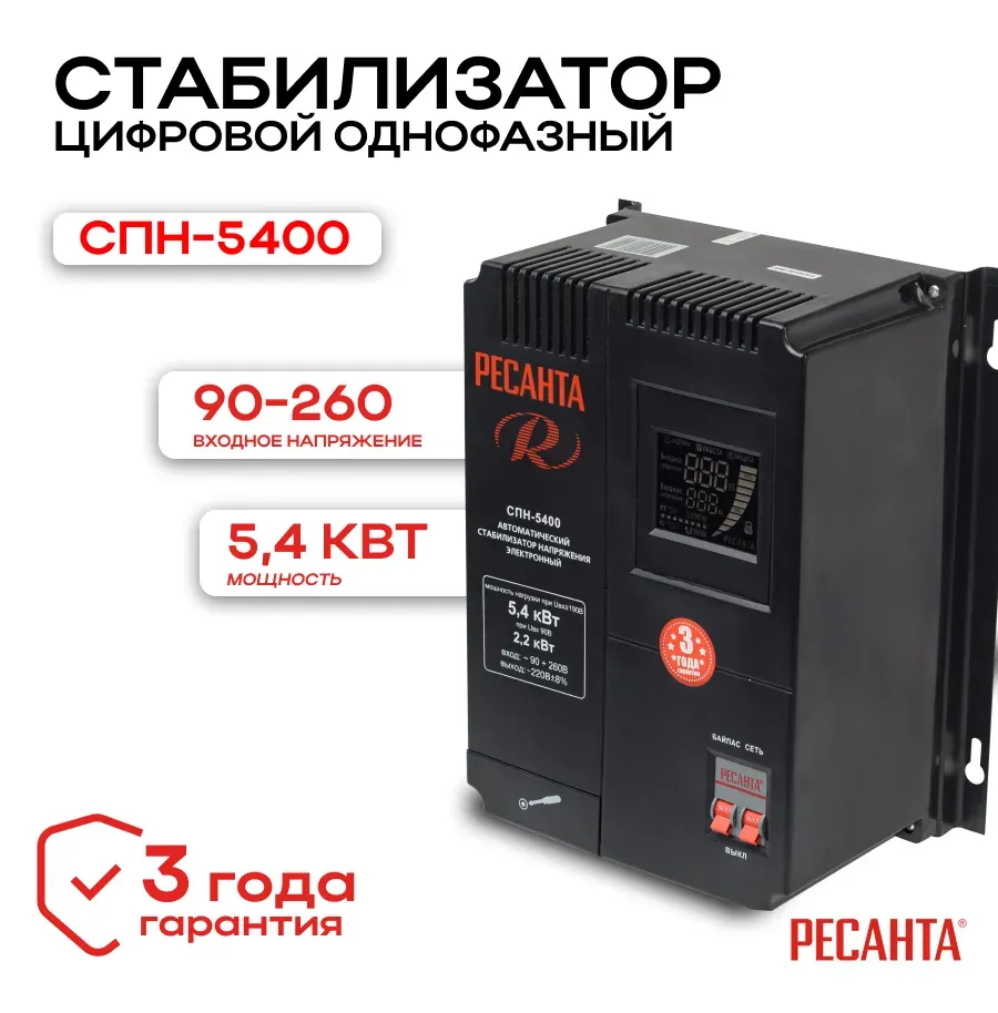 Стабилизатор пониженного напряжения Ресанта СПН-5400 предназначен для выравнивания сетевого напряжения в диапазоне от 90 В до 260 В с суммарной мощностью до 5400 Вт. Благодаря металлическому корпусу внутренние узлы защищены от механических повреждений. Стабилизатор Ресанта оснащен цифровым дисплеем, показывающим основные параметры работы. С помощью функции \'\'Байпас\'\' можно выключить устройство и подключить нагрузку в обход стабилизатора к питающей сети одним нажатием кнопки. Преимущества - -Аварийное отключение нагрузки при превышении максимальных показателей напряжения. -Контроль входного и выходного напряжения. -Термозащита. -Небольшие размеры. -Фильтрация сетевых помех на входе и выходе. -В комплект входит коплект крепления для монтажа на стену.