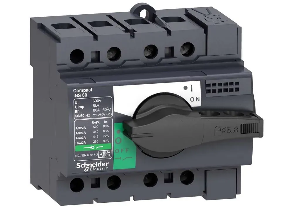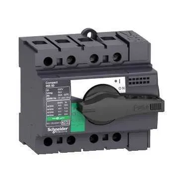Выключатель-разъединитель серии Compact INS Schneider Electric, 3-полюсный, номинальный ток 63 А, тип управления Черная поворотная рукоятка, исполнение - стационарный, монтаж - DIN-рейка, панель, ВхШхГ - 85x90x62.5 мм. Аппараты Compact INS предназначены для применения в сетях до 690 В пер. тока и 250 В пост. тока. Выключатели-разъединители не имеют защиты от сверхтоков и, должны быть защищены автоматическим выключателем или предохранителем.