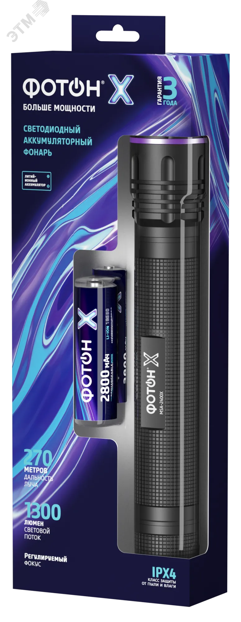 Фонарь \'\'ФОТОН-Х\'\' MSA-2400X - фонарь профессионального класса. Работает от 2-х сменных Li-Ion аккумуляторов типоразмера 18650 (в комплекте). Обеспечивает световой поток до 1300 люменов и дальность луча 270 метров. Регулировка фокуса позволяет плавно менять угол и дальность освещения. Предоставляется безусловная гарантия 3 года.