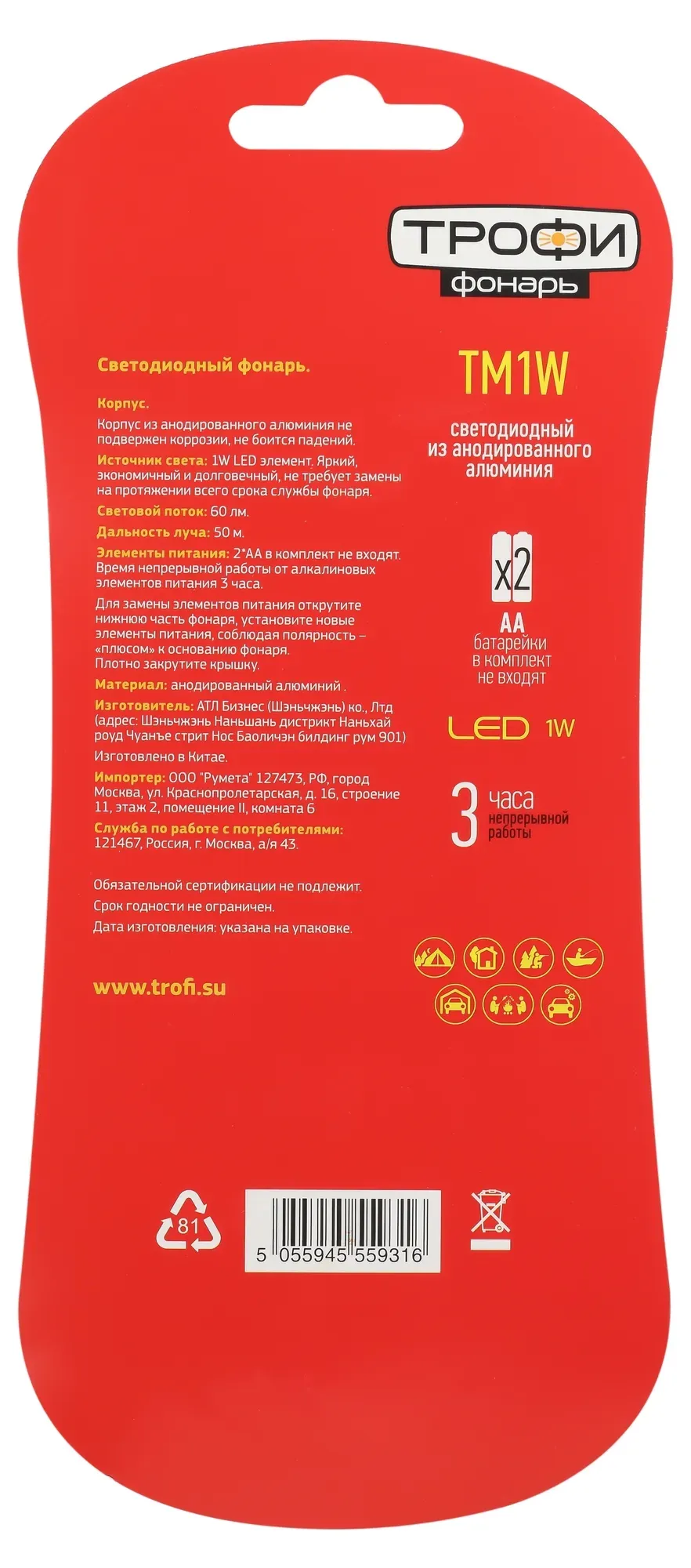 Трофи ТМ1W - компактный светодиодный фонарь с удобной удлиненной ручкой. Корпус изготовлен из прочного анодированного алюминия. Универсальный лаконичный дизайн, базовый черный цвет. Хорошая дальность светового луча. Корпус из прочного анодированного алюминия не боится падений и ударов, устойчив к возникновению царапин и сколов. Трофи ТМ1W будет выглядеть, как новый, даже спустя годы. Нацелен на долгосрочную работу и современный светодиод. Он не перегорит, не потускнеет со временем и не потребует замены. Мощность (1 Вт) и качество LED-элемента обеспечивают высокие для такого небольшого фонаря световые характеристики - дальность луча - 50 метров, световой поток - 60 лм. От двух алкалиновых пальчиковых батареек (АА) Трофи ТМ1W работает 3 активных часа.