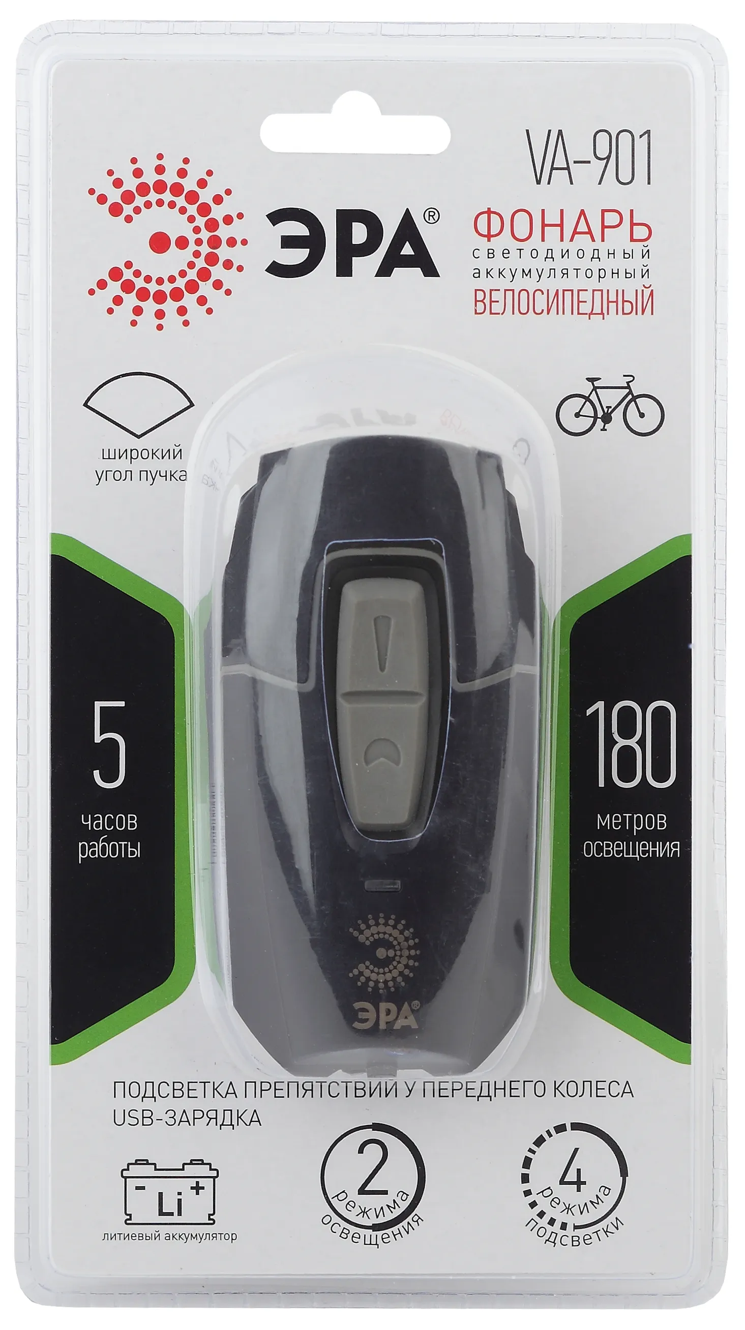 ЭРА VA-901 - светодиодный велосипедный фонарь на емком литиевом аккумуляторе. Не требует батареек и удобно заряжается от USB. От одной подзарядки работает свыше 5 активных часов благодаря емкому литиевому аккумулятору. Два режима освещения и 4 режима подсветки. Высокая дальность освещения и широкий угол светового пучка. В комплекте с прочным велосипедным фонарем поставляется надежное крепление и провод microUSB для подзарядки. Провод универсальный - подходит для заряда любых мобильных гаджетов с аналогичным разъемом. Режимы можно комбинировать. А также менять яркость в зависимости от ситуации - от максимально яркого света до эконом-режима. В нештатной ситуации оперативно включается аварийный режим мигания.