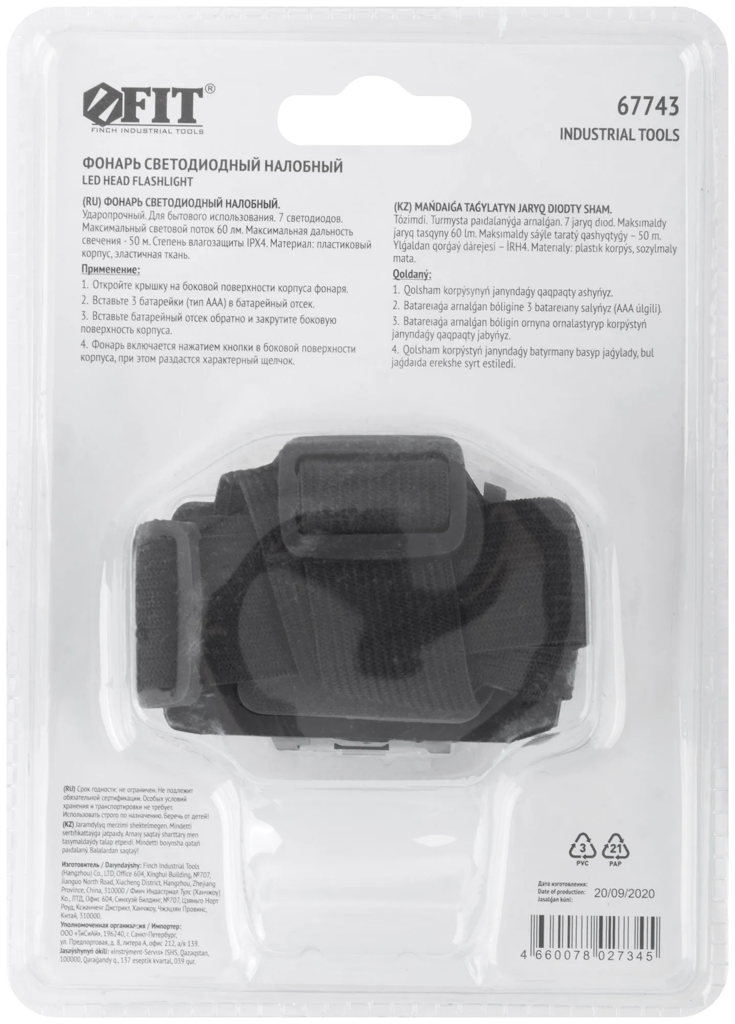 С возможностью крепления на голову. Ударопрочный. 7 светодиодных источников света. Материал - пластиковый корпус, резиновое крепление. Упаковка - блистер.