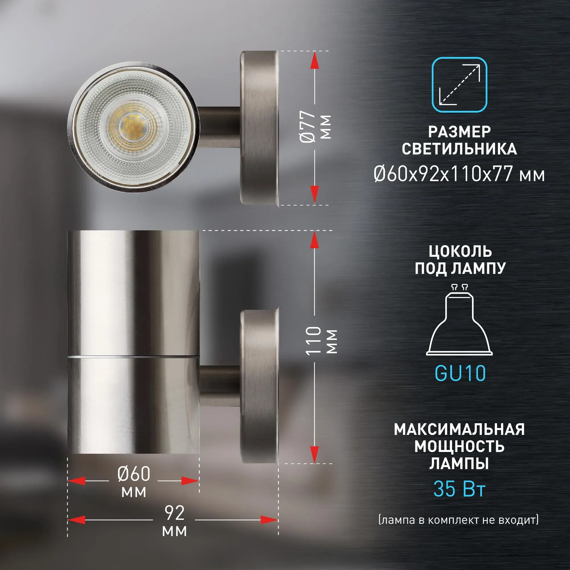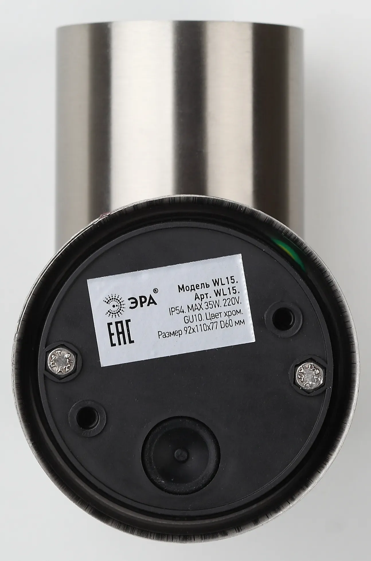 Светильник декоративный настенный WL15 создает интересные световые композиции, подчеркивает структуру материалов. Подходит для наружного уличного освещения и влажных помещений. Цоколь для источника света GU10, напряжение питания 220В ~50/60Гц, материал нержавеющая сталь/стекло, цвет светильника хром, размер 92*110*77 мм, D60 мм, максимальная мощность лампы 50 Вт, степень защиты IP44.