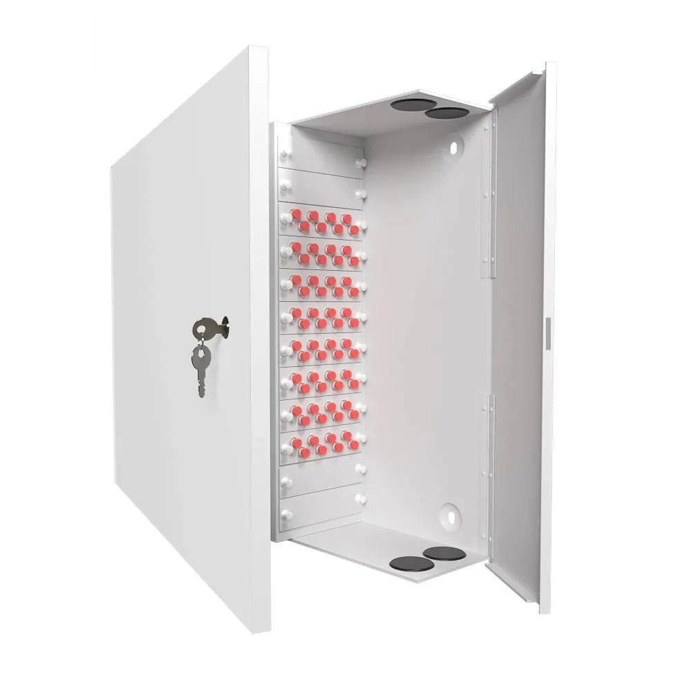 Кросс настенный, укомплектованный, 64 порта FC/UPC, 50/125 мкм со сменными адаптерными планками предназначен для установки на любую плоскую поверхность и подключения волоконного оптического кабеля и оптических шнуров в волоконно-оптических линиях связи, а также их маркировки.