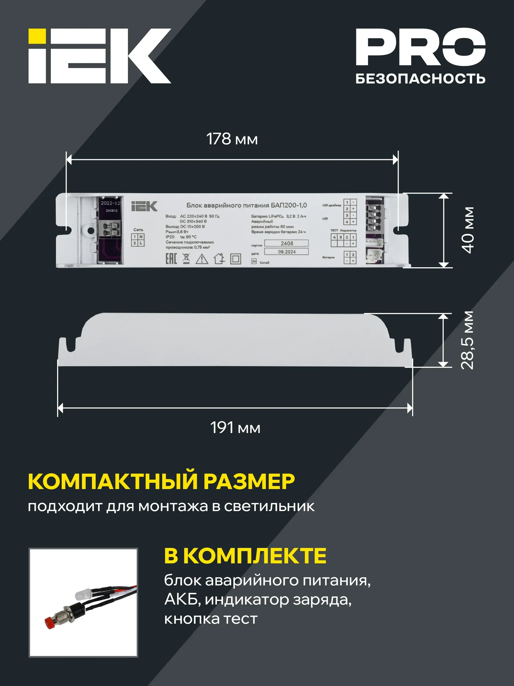 Блок аварийного питания (БАП) предназначен для обеспечения бесперебойного освещения помещений светодиодными светильниками в случае непредвиденного отключения сети 230В. БАП200 позволяет питать постоянным напряжением от 0 до 120В (регулируется DIPпереключателем) светодиодные модули различных конфигураций. Обязательным условием является наличие доступа к драйверу. Блок аварийного питания IEK состоит из электронного пускорегулирующего аппарата (конвертера), герметичной никелькадмиевой аккумуляторной батареи, светодиодного индикатора наличия сети и подзарядки аккумулятора с кнопкой \'\'ТЕСТ\'\'.Блоки БАП 200 имеют возможность питания светодиодных модулей различных конфигураций, от дискретных светодиодов до светодиодных линеек и плат, питаемых как постоянным током, так и постоянным напряжением. Это дает возможность преобразовать светильники типа \'\'Armstrong\'\', downlights, spotlight.
