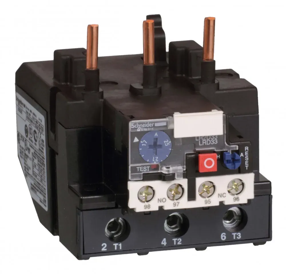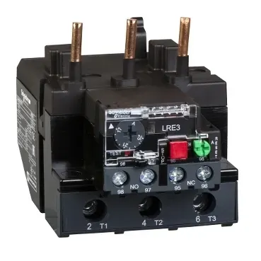 Тепловые реле перегрузки серии LRE EasyPact TVS Schneider Electric, 3Р, диапазон уставок тока (30 - 40) A, класс срабатывания 10A, номинальное напряжение до 690 В 50/60 Гц, степень защиты IP20. Реле предназначены для защиты цепей и электродвигателей от перегрузок, обрыва фазы, превышения длительности пуска и заклинивания ротора. Реле LRE применяются совместно с контакторами серии LC1E. Реле поставляются с переключателем режимов, защищенным крышкой, в положении ручного возврата.