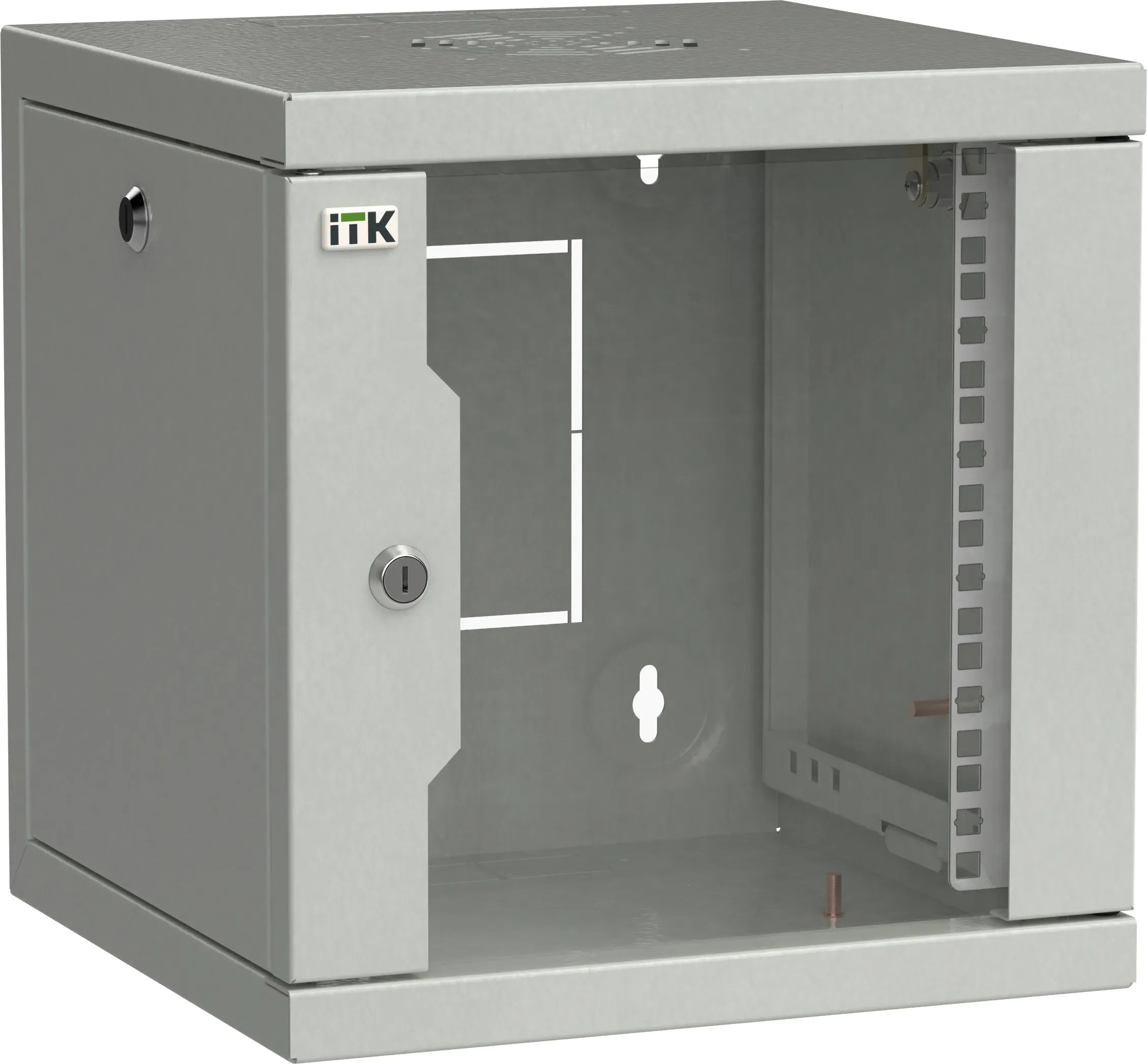 монтажный шкаф - 10-дюймовое исполнение - высота 12 юнитов - 649.5х390х300 мм - уст. размер 254 мм - со стеклянной дверью - открывающиеся стенки - возможность установки вентилятора - цвет серый (RAL 7035) - собранный