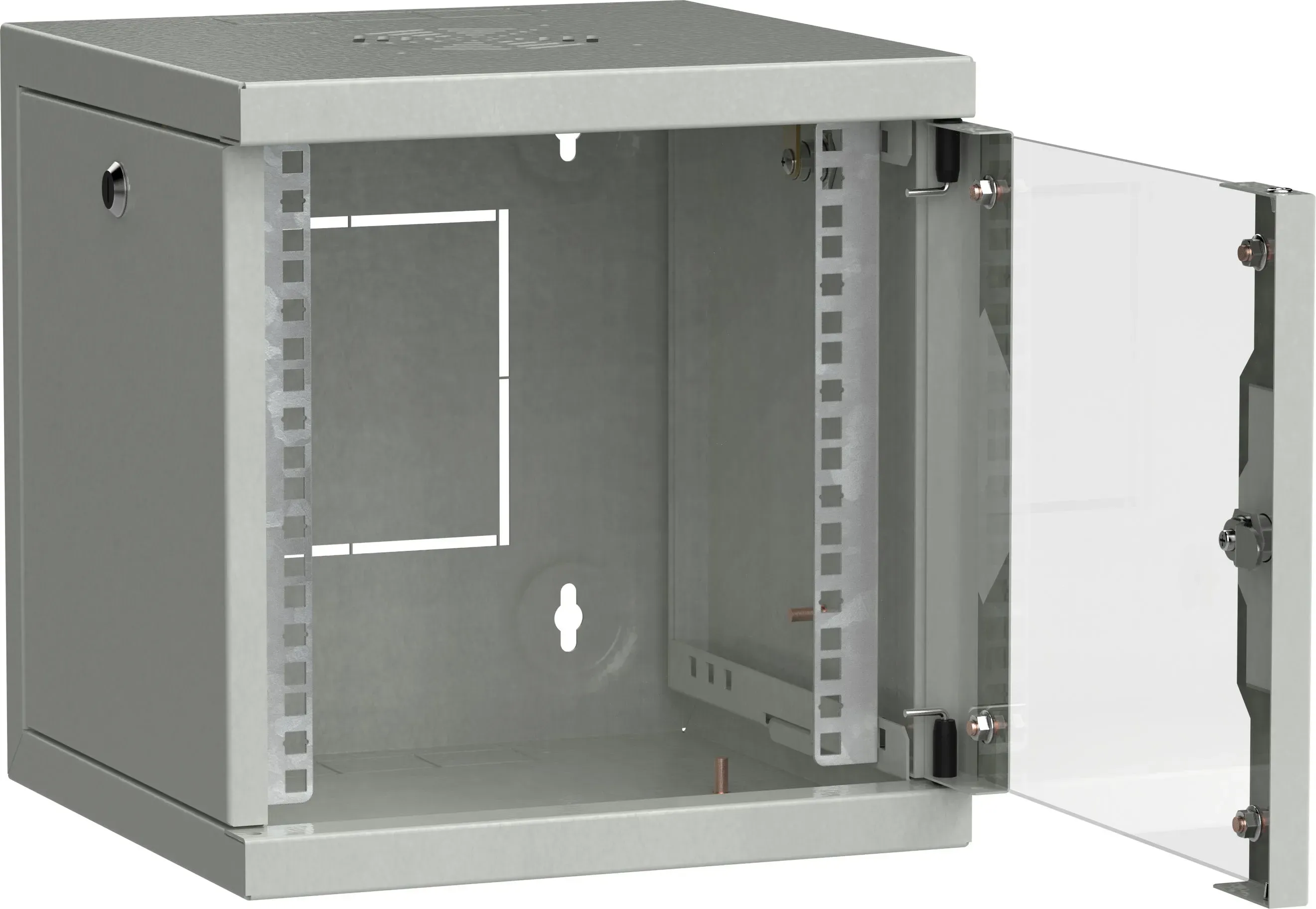 монтажный шкаф - 10-дюймовое исполнение - высота 9 юнитов - 499.5х390х300 мм - уст. размер 254 мм - со стеклянной дверью - открывающиеся стенки - возможность установки вентилятора - цвет серый (RAL 7035) - собранный