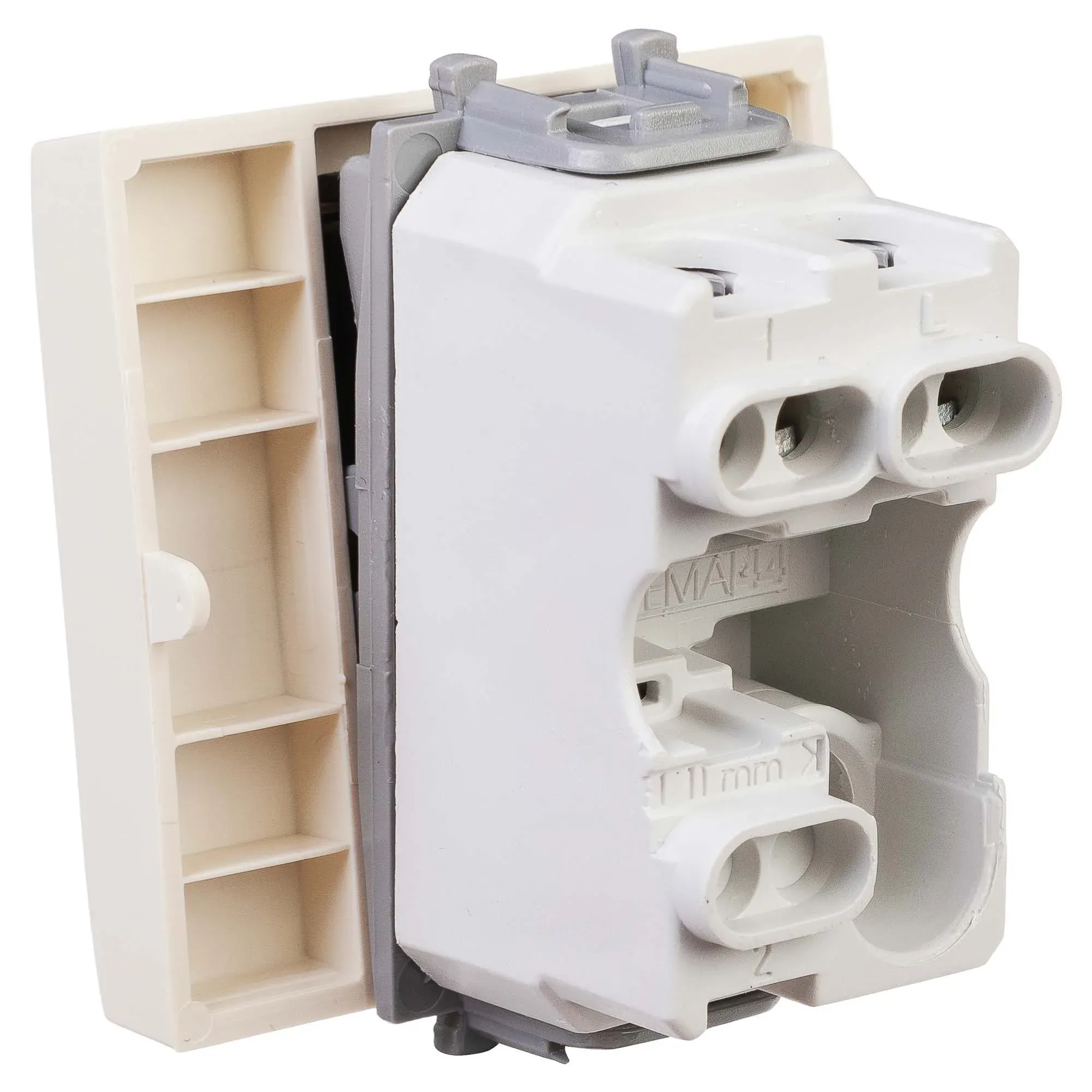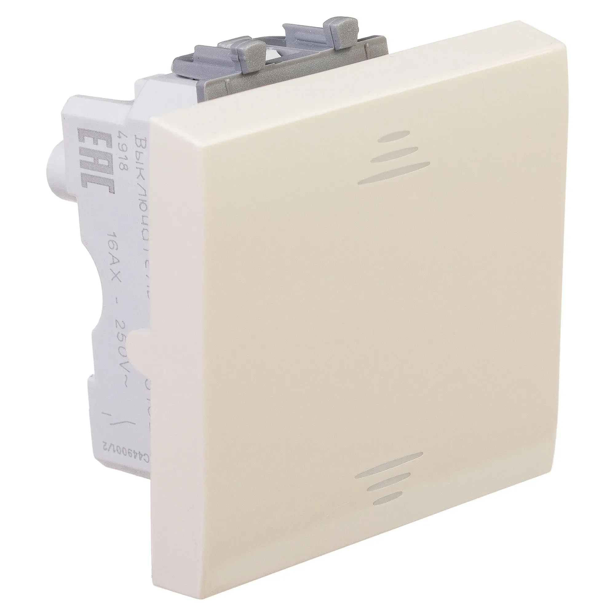 Выключатель одноклавишный однополюсный, модульный. Предназначен для монтажа в системы \'In-liner Front\' и \'In-liner Aero\' при помощи рамок-суппортов и каркасов \'Avanti\' (код 4400912 и т.д.), Используется для включения/выключения освещения. Характеристики- диаметр отверстий для ввода кабелей – 3 мм (по 2 отверстия на одну клемму), винтовые зажимы, шаблон для зачистки кабеля – 11 мм, номинальный ток – 16 A, номинальное напряжение – 230 В, возможна фиксация в подрозеточные коробки при помощи каркаса с лапками (код 4400802) и саморезов. 2 модуля. Цвет- \'Ванильная дымка\'.